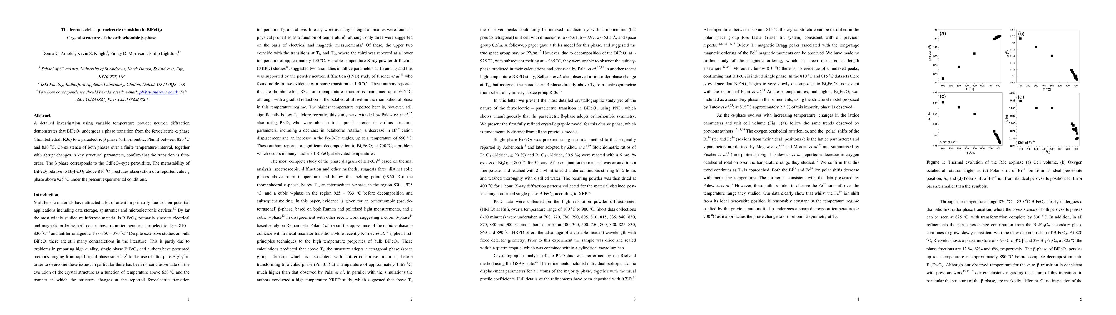This study reveals that BiFeO3 transitions from a ferroelectric rhombohedral alpha phase to a paraelectric orthorhombic beta phase between 820°C and 830°C, confirmed via variable temperature powder neutron diffraction. The first-order nature of the transition is evidenced by the co-existence of both phases and significant structural changes.