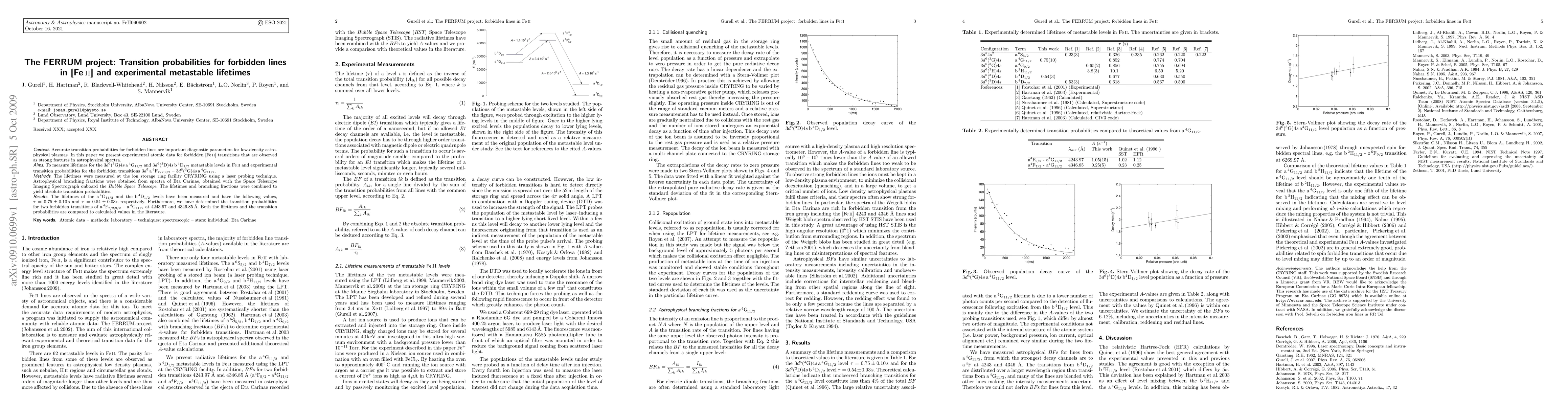 This paper reports experimental measurements of metastable lifetimes and transition probabilities for forbidden [FeII] lines using the CRYRING ion storage ring and Hubble Space Telescope data, providing crucial atomic data for astrophysical plasma diagnostics.