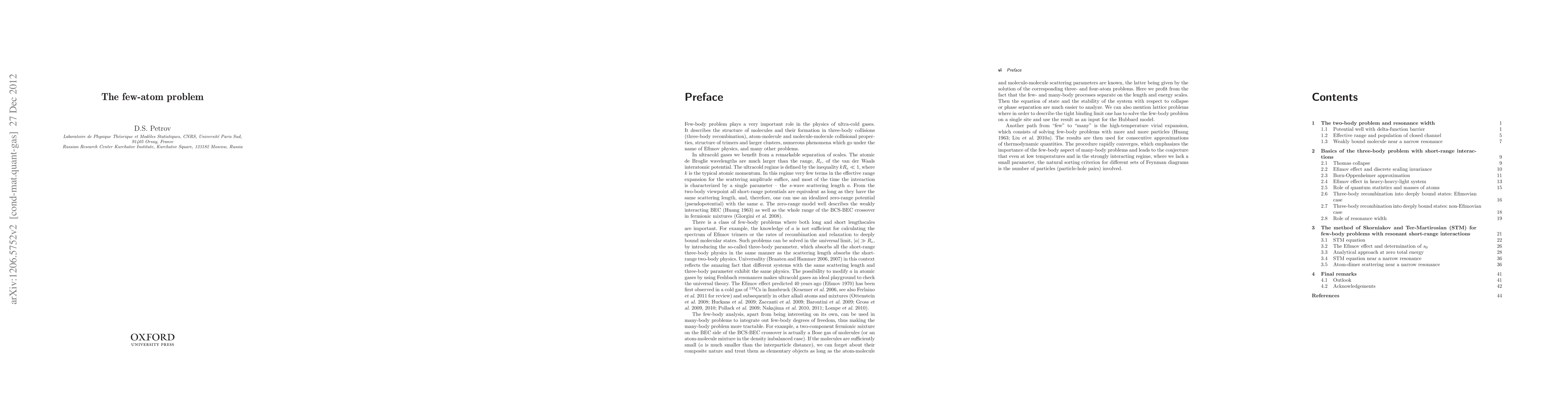 These lectures contain a theoretical introduction to the few-body problem with short-range resonant binary interactions. In the first part we discuss the effective range expansion for the two-body scattering amplitude emphasizing the role of the resonance width. In the second part we review the Efimov effect for three atoms, describe the difference in between the Efimovian and non-Efimovian regimes, and discuss the dependence of three-body observables on quantum symmetry, mass imbalance, and resonance width. In the third part we derive the Skorniakov and Ter-Martirosian equation and give several illustrative examples of its solution.