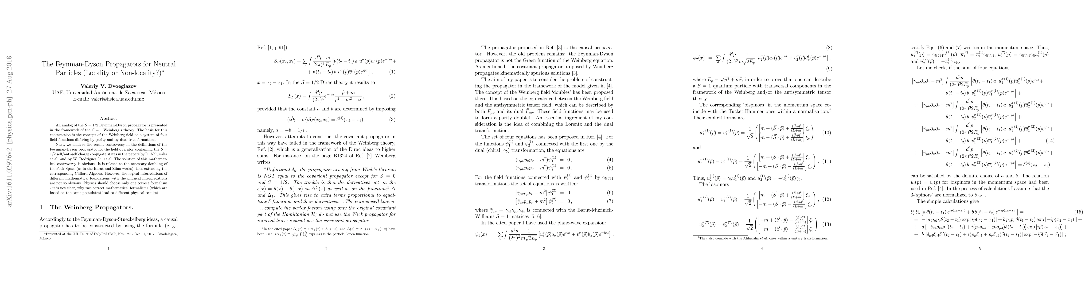 An analog of the S=1/2 Feynman-Dyson propagator is presented in the framework of the S=1 Weinberg theory. The basis for this construction is the concept of the Weinberg field as a system of four field functions differing by parity and by dual transformations. Next, we analyze the recent controversy in the definitions of the Feynman-Dyson propagator for the field operator containing the S=1/2 self/anti-self charge conjugate states in the papers by D. Ahluwalia et al. and by W. Rodrigues Jr. et al. The solution of this mathematical controversy is obvious. It is related to the necessary doubling of the Fock Space (as in the Barut and Ziino works), thus extending the corresponding Clifford Algebra. However, the logical interrelations of different mathematical foundations with the physical interpretations are not so obvious. Physics should choose only one correct formalism, it is not clear, why two correct mathematical formalisms (which are based on the same postulates) lead to different physical results?