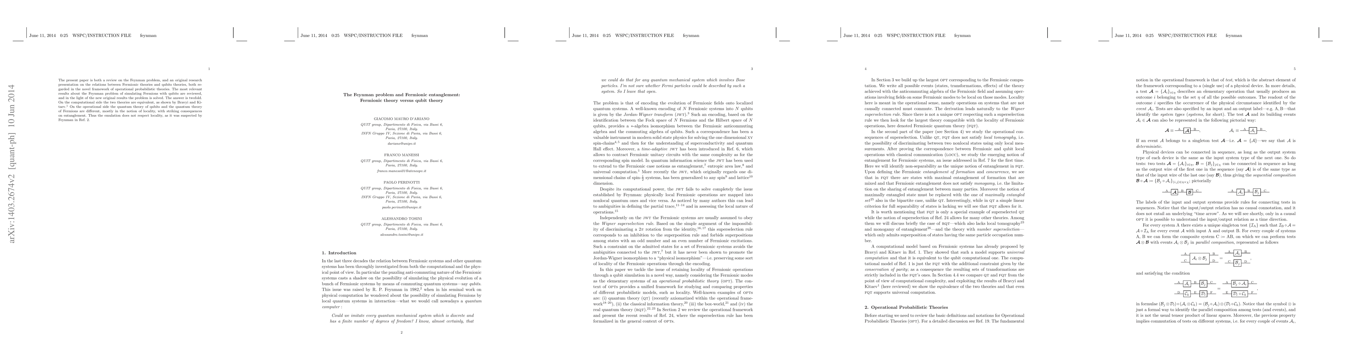 The present paper is both a review on the Feynman problem, and an original research presentation on the relations between Fermionic theories and qubits theories, both regarded in the novel framework of operational probabilistic theories. The most relevant results about the Feynman problem of simulating Fermions with qubits are reviewed, and in the light of the new original results the problem is solved. The answer is twofold. On the computational side the two theories are equivalent, as shown by Bravyi and Kitaev (Ann. Phys. 298.1 (2002): 210-226). On the operational side the quantum theory of qubits and the quantum theory of Fermions are different, mostly in the notion of locality, with striking consequences on entanglement. Thus the emulation does not respect locality, as it was suspected by Feynman (Int. J. Theor. Phys. 21.6 (1982): 467-488).