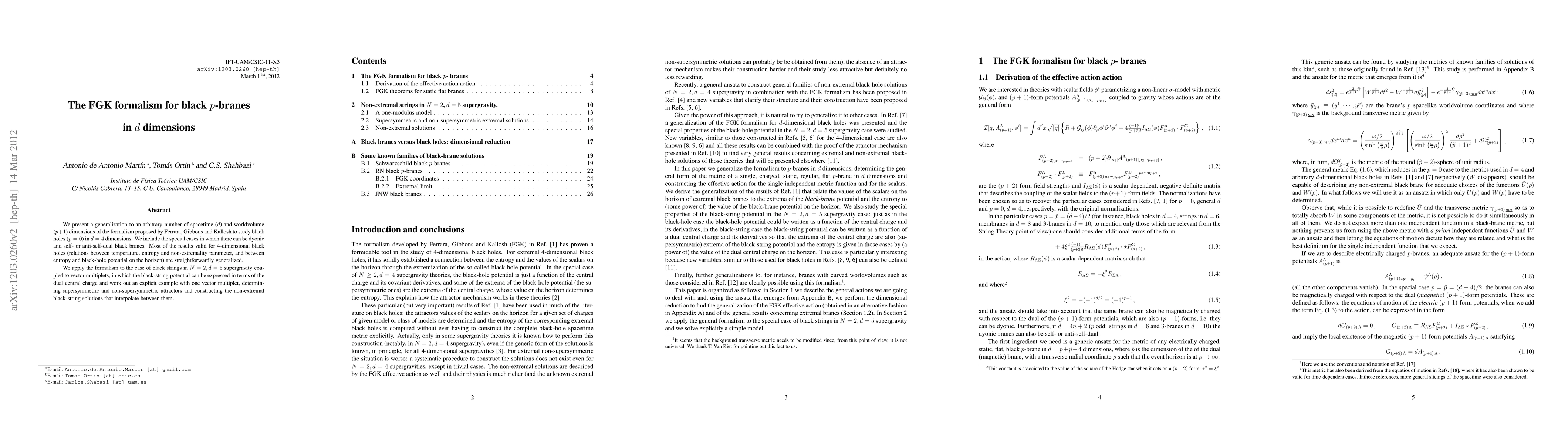 This paper generalizes the FGK formalism to study black p-branes in arbitrary dimensions, extending results from 4-dimensional black holes to higher dimensions. It applies the formalism to black strings in N=2, d=5 supergravity, determining potentials and constructing solutions for both supersymmetric and non-supersymmetric cases.