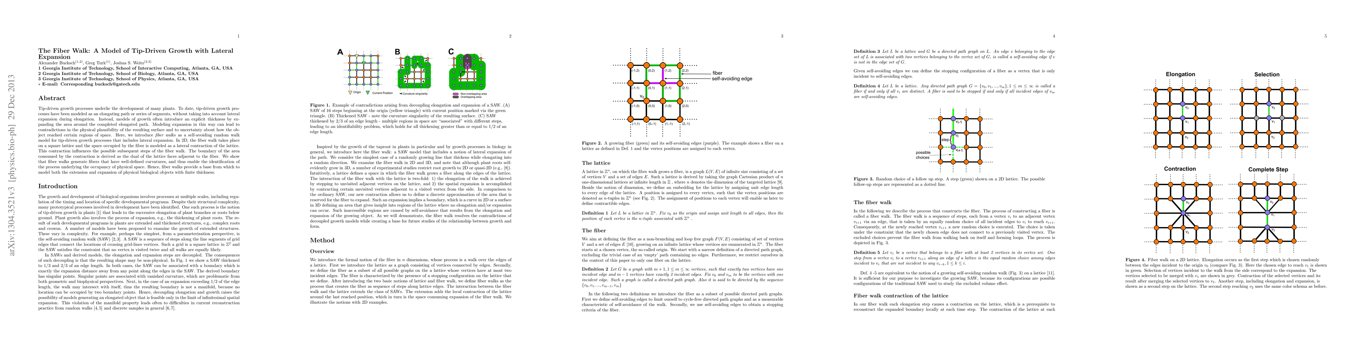 Tip-driven growth processes underlie the development of many plants. To date, tip-driven growth processes have been modelled as an elongating path or series of segments without taking into account lateral expansion during elongation. Instead, models of growth often introduce an explicit thickness by expanding the area around the completed elongated path. Modelling expansion in this way can lead to contradictions in the physical plausibility of the resulting surface and to uncertainty about how the object reached certain regions of space. Here, we introduce "fiber walks" as a self-avoiding random walk model for tip-driven growth processes that includes lateral expansion. In 2D, the fiber walk takes place on a square lattice and the space occupied by the fiber is modelled as a lateral contraction of the lattice. This contraction influences the possible follow-up steps of the fiber walk. The boundary of the area consumed by the contraction is derived as the dual of the lattice faces adjacent to the fiber. We show that fiber walks generate fibers that have well-defined curvatures, enable the identification of the process underlying the occupancy of physical space. Hence, fiber walks provide a base from which to model both the extension and expansion of physical biological objects with finite thickness.