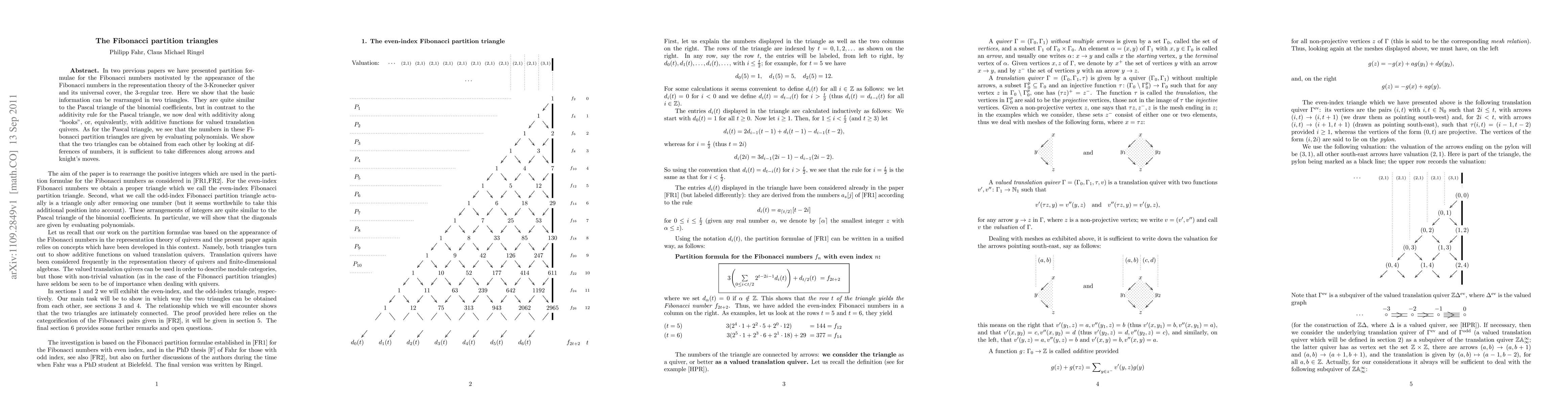 In two previous papers we have presented partition formulae for the Fibonacci numbers motivated by the appearance of the Fibonacci numbers in the representation theory of the 3-Kronecker quiver and its universal cover, the 3-regular tree. Here we show that the basic information can be rearranged in two triangles. They are quite similar to the Pascal triangle of the binomial coefficients, but in contrast to the additivity rule for the Pascal triangle, we now deal with additivity along hooks, or, equivalently, with additive functions for valued translation quivers. As for the Pascal triangle, we see that the numbers in these Fibonacci partition triangles are given by evaluating polynomials. We show that the two triangles can be obtained from each other by looking at differences of numbers, it is sufficient to take differences along arrows and knight's moves.