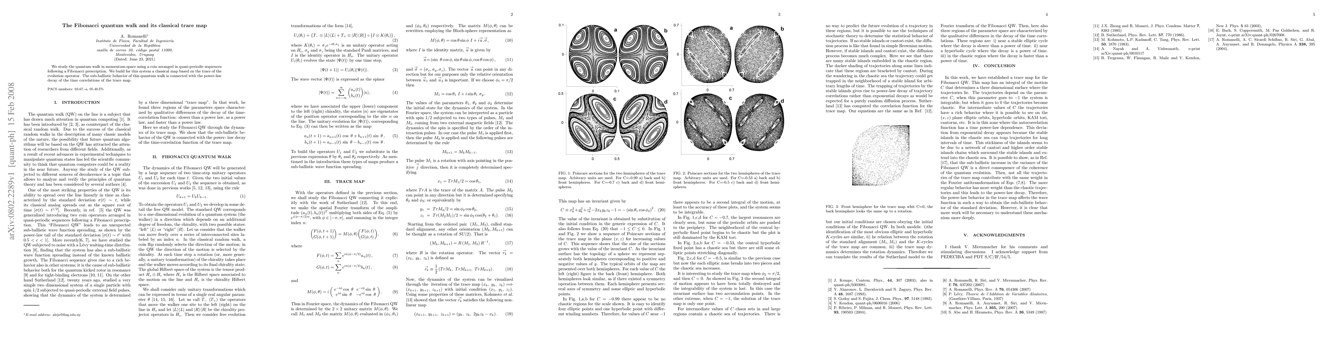 We study the quantum walk in momentum space using a coin arranged in quasi-periodic sequences following a Fibonacci prescription. We build for this system a classical map based on the trace of the evolution operator. The sub-ballistic behavior of this quantum walk is connected with the power-law decay of the time correlations of the trace map.
