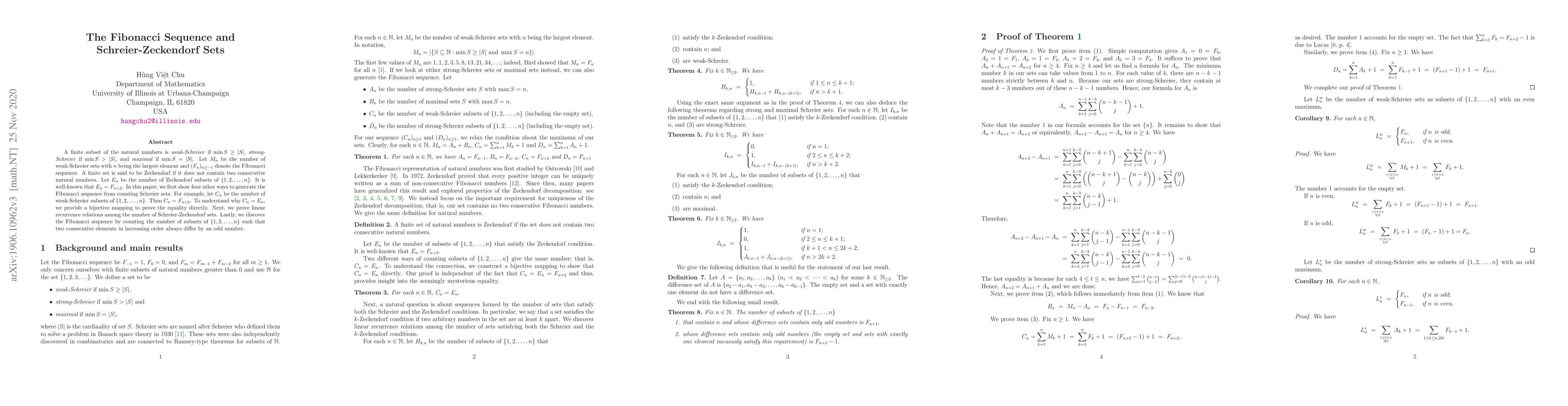 A finite subset of the natural numbers is weak-Schreier if $\min S \ge |S|$, strong-Schreier if $\min S>|S|$, and maximal if $\min S = |S|$. Let $M_n$ be the number of weak-Schreier sets with $n$ being the largest element and $(F_n)_{n\geq -1}$ denote the Fibonacci sequence. A finite set is said to be Zeckendorf if it does not contain two consecutive natural numbers. Let $E_n$ be the number of Zeckendorf subsets of $\{1,2,\ldots,n\}$. It is well-known that $E_n = F_{n+2}$. In this paper, we first show four other ways to generate the Fibonacci sequence from counting Schreier sets. For example, let $C_n$ be the number of weak-Schreier subsets of $\{1,2,\ldots,n\}$. Then $C_n = F_{n+2}$. To understand why $C_n = E_n$, we provide a bijective mapping to prove the equality directly. Next, we prove linear recurrence relations among the number of Schreier-Zeckendorf sets. Lastly, we discover the Fibonacci sequence by counting the number of subsets of $\{1,2,\ldots, n\}$ such that two consecutive elements in increasing order always differ by an odd number.