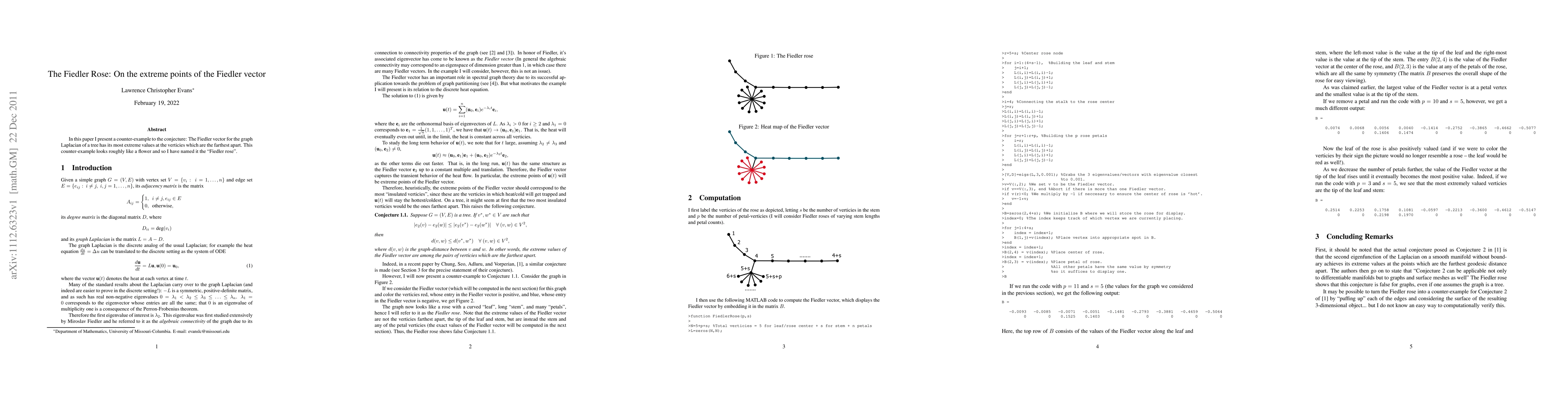 In this paper I present a counter-example to the conjecture: The Fiedler vector for the graph Laplacian of a tree has its most extreme values at the verticies which are the farthest apart. This counter-example looks roughly like a flower and so I have named it the "Fiedler rose".