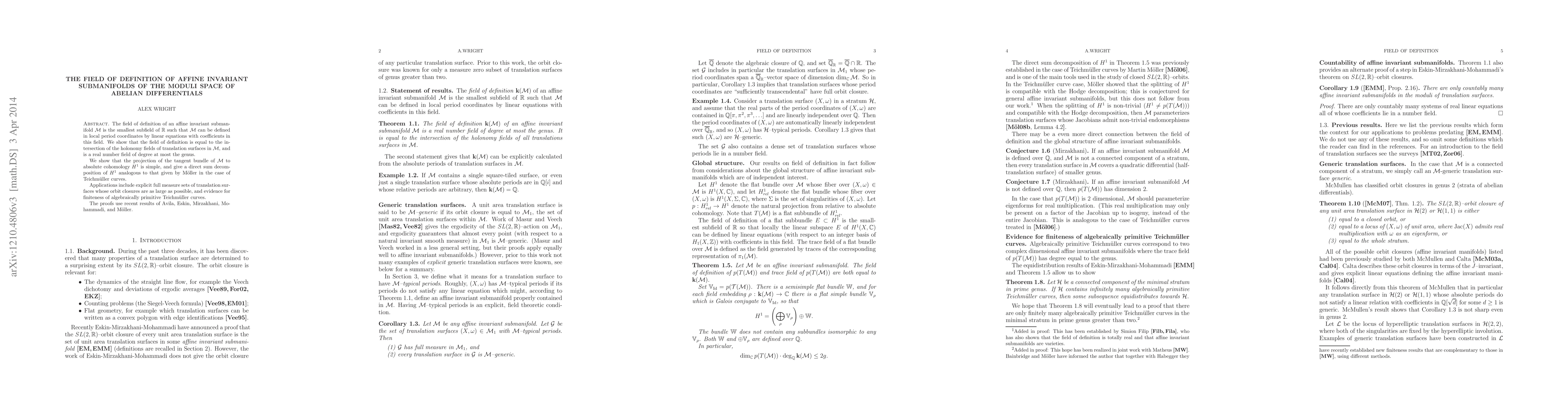 This paper investigates the field of definition for affine invariant submanifolds in the moduli space of abelian differentials, showing it equals the intersection of holonomy fields and is a real number field of degree at most the genus. It also demonstrates the simplicity of the projection of the tangent bundle's absolute cohomology, providing applications to translation surfaces and Teichmüller curves.