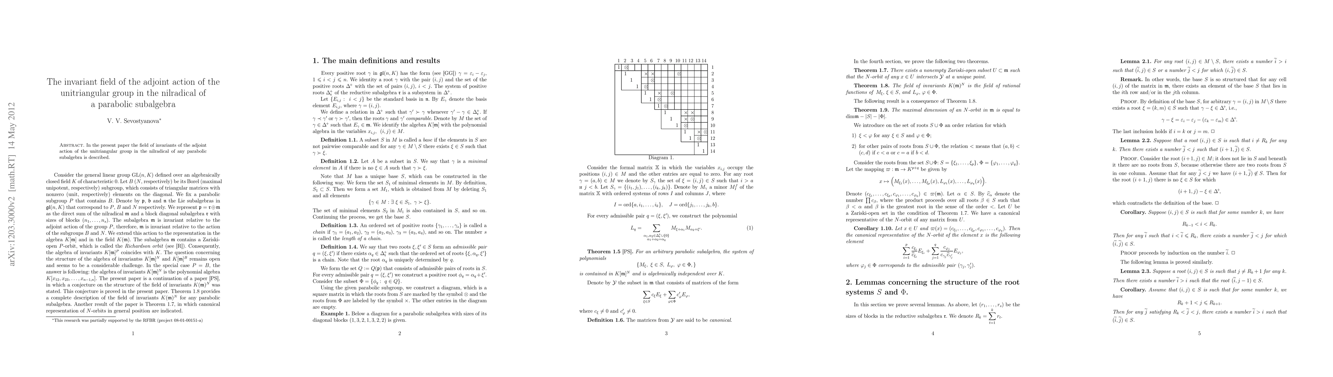 This paper describes the field of invariants resulting from the adjoint action of the unitriangular group within the nilradical of any parabolic subalgebra, providing crucial insights into algebraic structures.