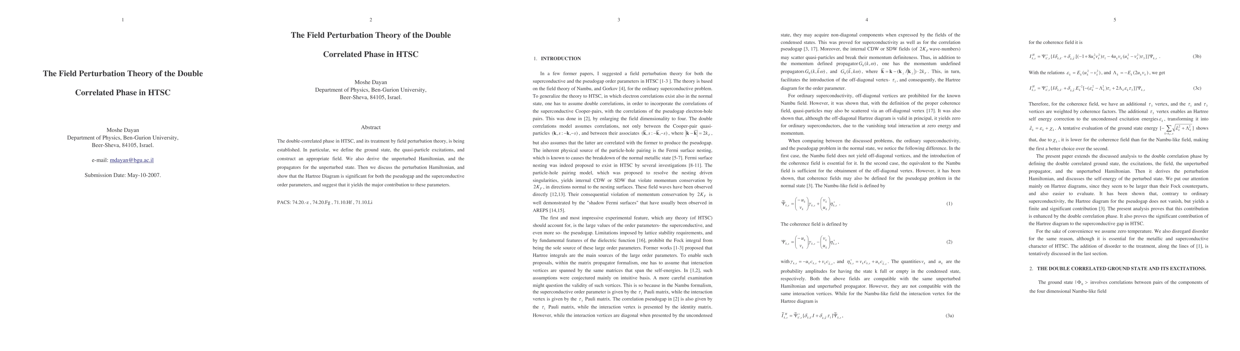 The Double-Correlated phase in HTSC, and its treatment by field perturbation theory, is established. In particular, we define the ground state, the quasi-particle excitations, and construct an appropriate field. We also derive the unperturbed Hamiltonian, and the propagators for the unperturbed state. Then we discuss the perturbation Hamiltonian, and show that the Hartree diagram is significant for both the pseudogap and the superconductive order parameter, and suggest that it yields the major contribution to these parameters.