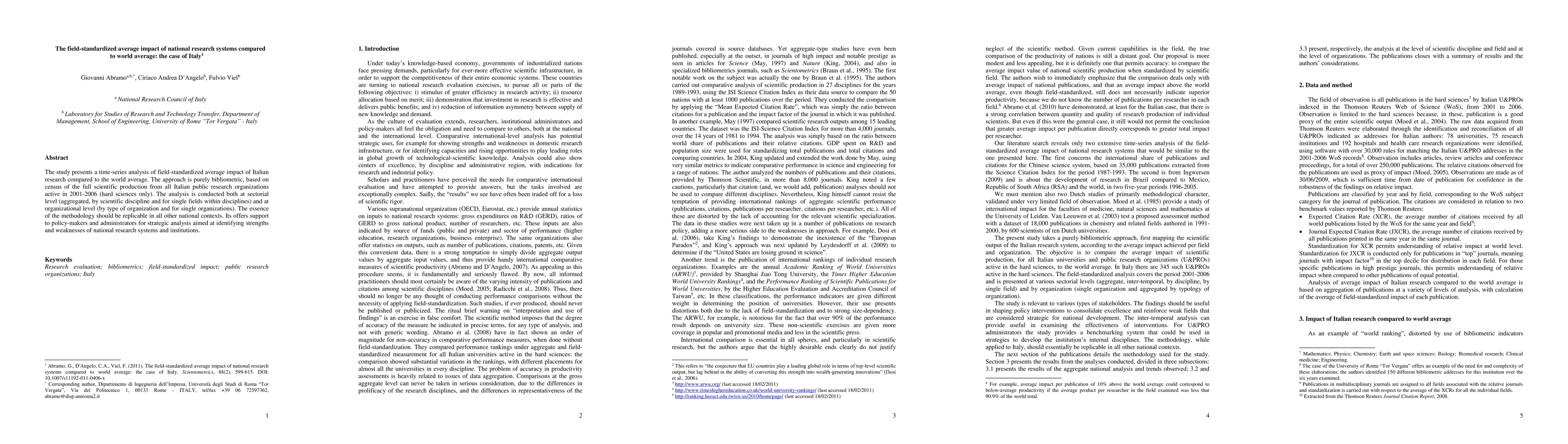 This study conducts a bibliometric analysis comparing the field-standardized average impact of Italy's scientific research to the global average, focusing on hard sciences from 2001-2006. The findings provide insights into the strengths and weaknesses of Italy's national research system, offering a replicable methodology for policy-makers and administrators.