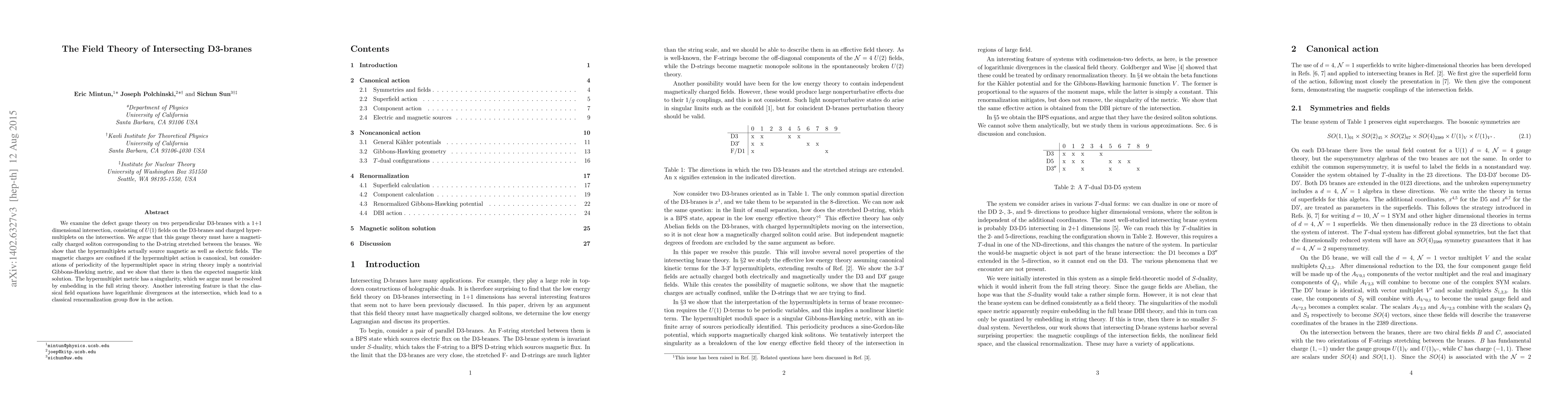 We examine the defect gauge theory on two perpendicular D3-branes with a 1+1 dimensional intersection, consisting of $U(1)$ fields on the D3-branes and charged hypermultiplets on the intersection. We argue that this gauge theory must have a magnetically charged soliton corresponding to the D-string stretched between the branes. We show that the hypermultiplets do source magnetic as well as electric fields, but the magnetic charges are confined if the hypermultiplet action is canonical. Considerations of periodicity of the hypermultiplet space lead to a nontrivial Gibbons-Hawking metric, and we show that there is then the expected magnetic kink solution. The hypermultiplet metric has a singularity, which we argue must be resolved by embedding in the full string theory. Another interesting feature is that the classical field equations have logarithmic divergences at the intersection, which lead to a classical renormalization group flow in the action.