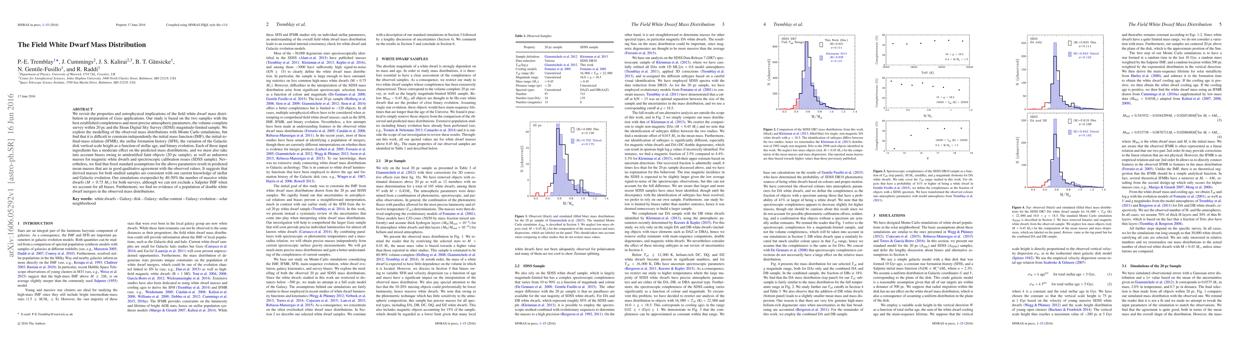 We revisit the properties and astrophysical implications of the field white dwarf mass distribution in preparation of Gaia applications. Our study is based on the two samples with the best established completeness and most precise atmospheric parameters, the volume-complete survey within 20 pc and the Sloan Digital Sky Survey (SDSS) magnitude-limited sample. We explore the modelling of the observed mass distributions with Monte Carlo simulations, but find that it is difficult to constrain independently the initial mass function (IMF), the initial-to-final-mass relation (IFMR), the stellar formation history (SFH), the variation of the Galactic disk vertical scale height as a function of stellar age, and binary evolution. Each of these input ingredients has a moderate effect on the predicted mass distributions, and we must also take into account biases owing to unidentified faint objects (20 pc sample), as well as unknown masses for magnetic white dwarfs and spectroscopic calibration issues (SDSS sample). Nevertheless, we find that fixed standard assumptions for the above parameters result in predicted mean masses that are in good qualitative agreement with the observed values. It suggests that derived masses for both studied samples are consistent with our current knowledge of stellar and Galactic evolution. Our simulations overpredict by 40-50% the number of massive white dwarfs (M > 0.75 Msun) for both surveys, although we can not exclude a Salpeter IMF when we account for all biases. Furthermore, we find no evidence of a population of double white dwarf mergers in the observed mass distributions.