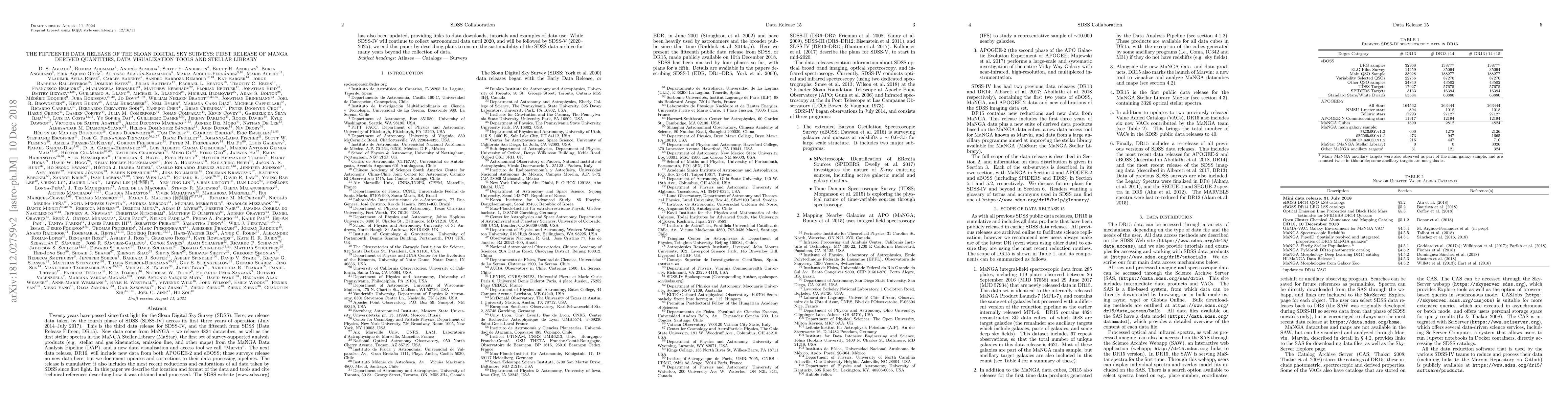 The Sloan Digital Sky Survey (SDSS) releases its fifteenth data set (DR15), including new data from the MaNGA survey, with 4824 datacubes, the first stellar spectra in the MaStar library, and new analysis products. The release also introduces the Marvin data visualization tool and updates the SDSS website with data access resources.