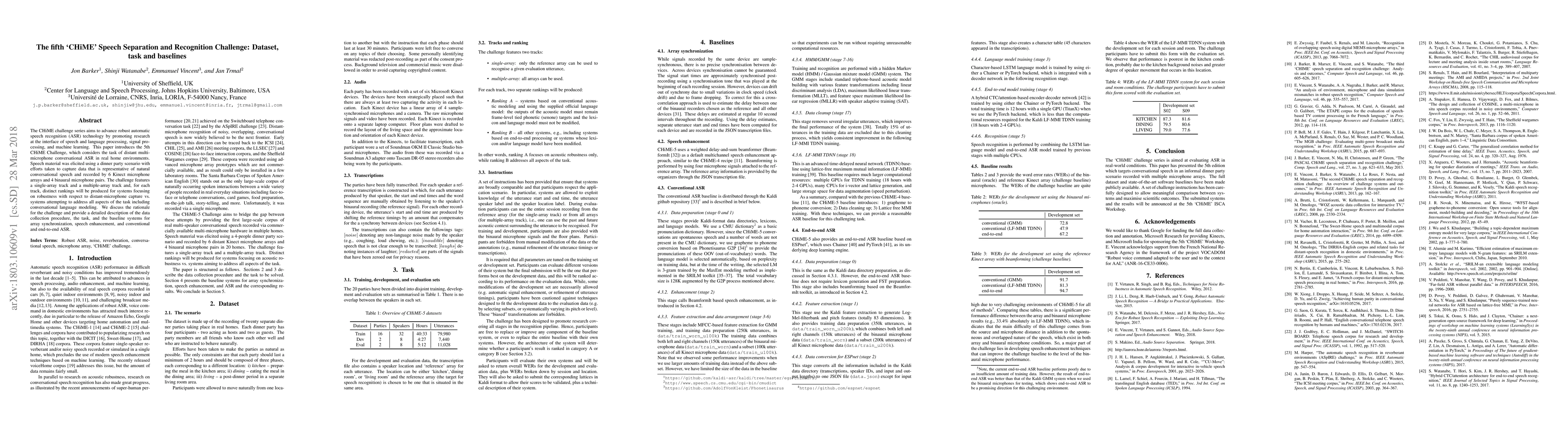 The fifth CHiME Challenge focuses on distant multi-microphone conversational ASR in real home environments, introducing new datasets and tasks to advance robust ASR technology. Baselines for array synchronization, speech enhancement, and ASR are provided to guide research efforts.