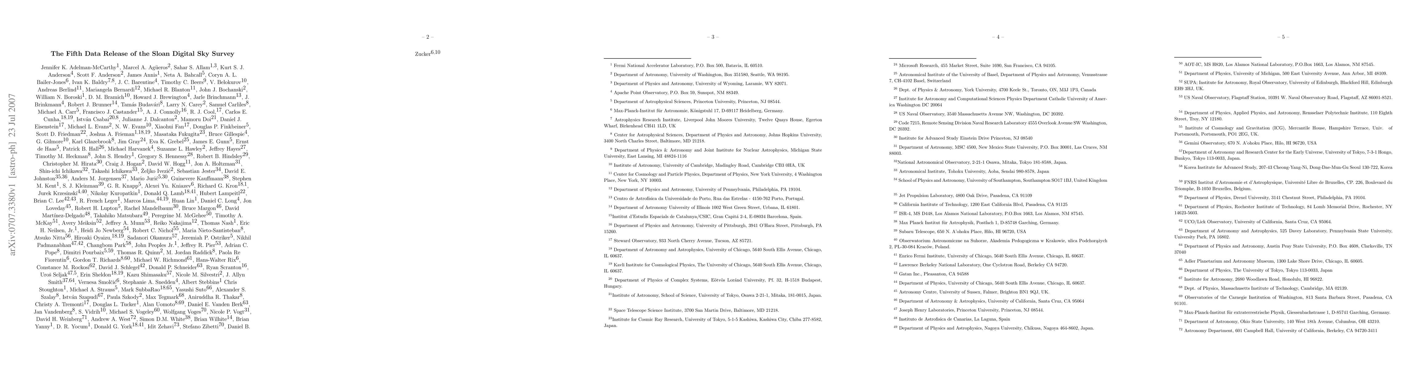 The Fifth Data Release (DR5) of the Sloan Digital Sky Survey (SDSS) includes all survey quality data from June 2005, marking the completion of SDSS-I, with a significant increase in photometric and spectroscopic data, including 217 million objects and 1,048,960 spectra. It also features new survey features and tools for statistical analysis.