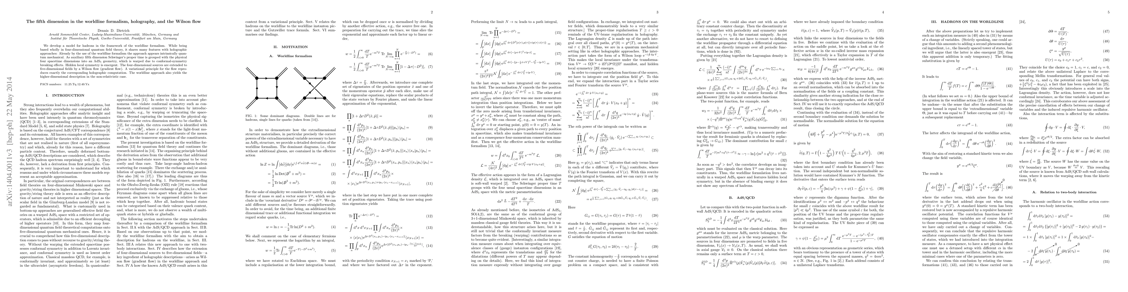 This paper develops a model for hadrons using the worldline formalism, which incorporates a fifth dimension through the AdS5 geometry and Schwinger's proper time. The approach, rooted in four-dimensional quantum field theory, emulates holographic methods and employs a Wilson flow to extend four-dimensional sources into five-dimensional fields, achieving exact correspondence with holographic computations.