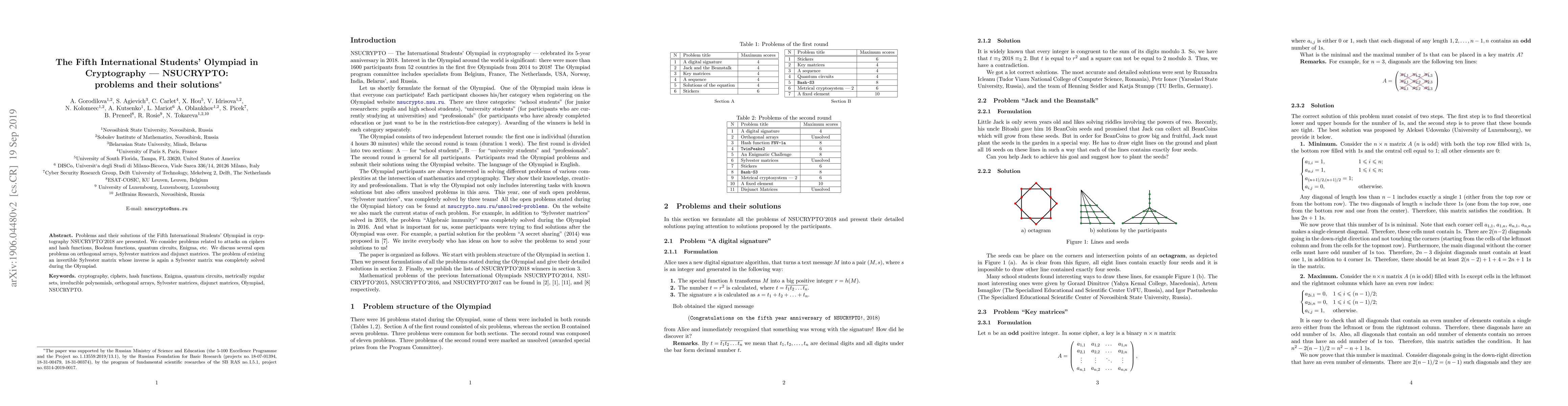 Summary: The Fifth International Students' Olympiad in Cryptography (NSUCRYPTO'2018) showcased problems on attacks on ciphers, hash functions, Boolean functions, quantum circuits, and Enigma machines. The solutions to these problems were presented, with particular focus on resolving the open problem concerning invertible Sylvester matrices.