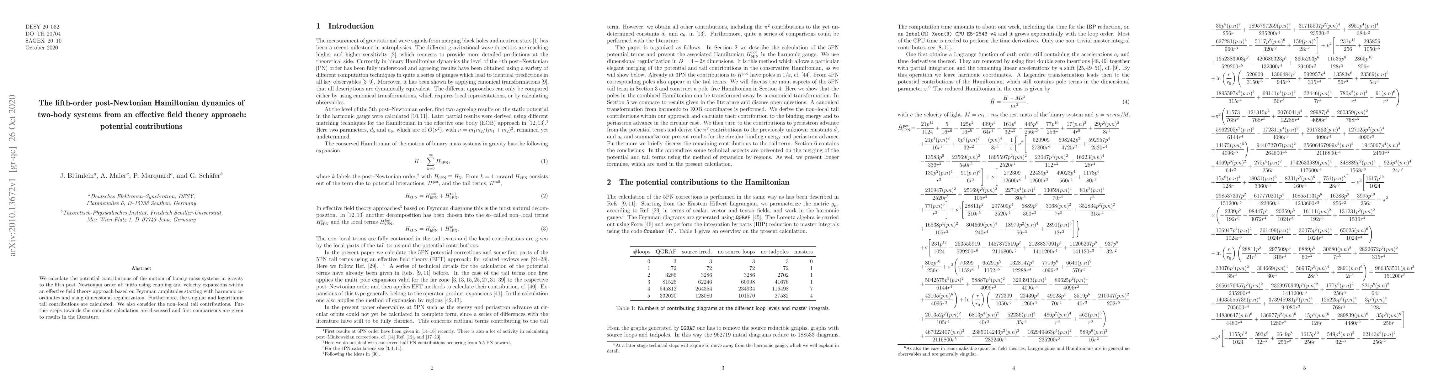 We calculate the potential contributions of the motion of binary mass systems in gravity to the fifth post--Newtonian order ab initio using coupling and velocity expansions within an effective field theory approach based on Feynman amplitudes starting with harmonic coordinates and using dimensional regularization. Furthermore, the singular and logarithmic tail contributions are calculated. We also consider the non--local tail contributions. Further steps towards the complete calculation are discussed and first comparisons are given to results in the literature.