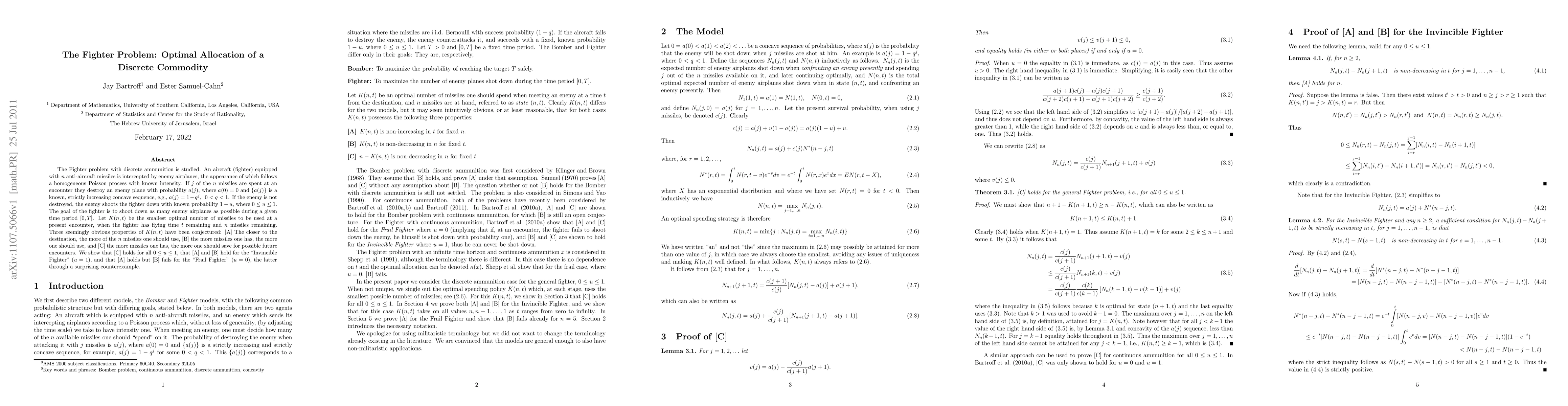The Fighter problem with discrete ammunition is studied. An aircraft (fighter) equipped with $n$ anti-aircraft missiles is intercepted by enemy airplanes, the appearance of which follows a homogeneous Poisson process with known intensity. If $j$ of the $n$ missiles are spent at an encounter they destroy an enemy plane with probability $a(j)$, where $a(0) = 0 $ and $\{a(j)\}$ is a known, strictly increasing concave sequence, e.g., $a(j) = 1-q^j, \; \, 0 < q < 1$. If the enemy is not destroyed, the enemy shoots the fighter down with known probability $1-u$, where $0 \le u \le 1$. The goal of the fighter is to shoot down as many enemy airplanes as possible during a given time period $[0, T]$. Let $K (n, t)$ be the smallest optimal number of missiles to be used at a present encounter, when the fighter has flying time $t$ remaining and $n$ missiles remaining. Three seemingly obvious properties of $K(n, t)$ have been conjectured: [A] The closer to the destination, the more of the $n$ missiles one should use, [B] the more missiles one has, the more one should use, and [C] the more missiles one has, the more one should save for possible future encounters. We show that [C] holds for all $0 \le u \le 1$, that [A] and [B] hold for the "Invincible Fighter" ($u=1$), and that [A] holds but [B] fails for the "Frail Fighter" ($u=0$), the latter through a surprising counterexample.