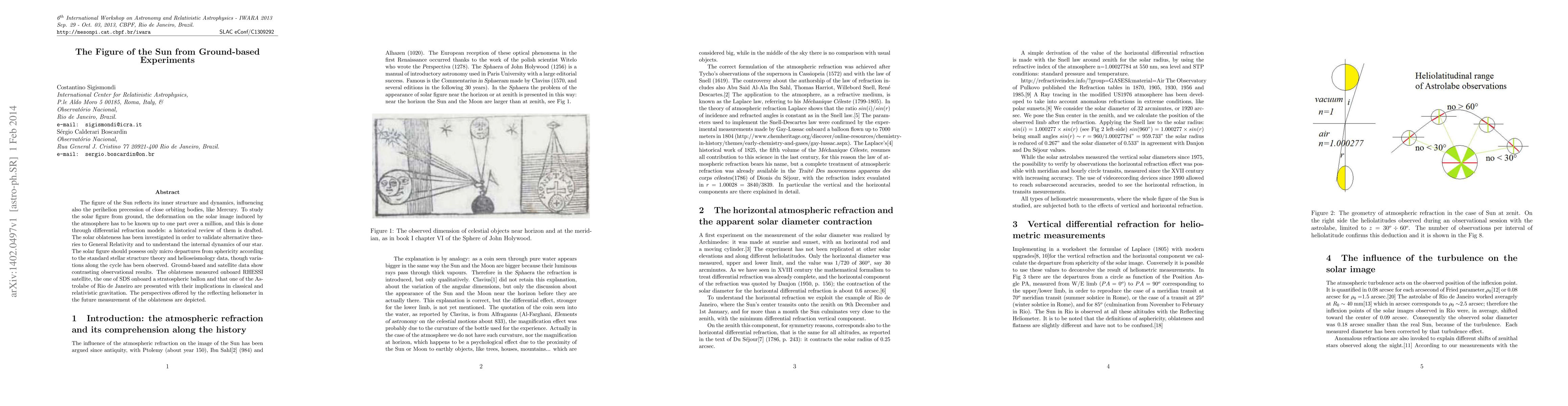 The figure of the Sun reflects its inner structure and dynamics, influencing also the perihelion precession of close orbiting bodies, like Mercury. To study the solar figure from ground, the deformation on the solar image induced by the atmosphere has to be known up to one part over a million, and this is done through differential refraction models: a historical review of them is drafted. The solar oblateness has been investigated in order to validate alternative theories to General Relativity and to understand the internal dynamics of our star. The solar figure should possess only micro departures from sphericity according to the standard stellar structure theory and helioseismology data, though variations along the cycle has been observed. Ground-based and satellite data show contrasting observational results. The oblateness measured onboard RHESSI satellite, the one of SDS onboard a stratospheric ballon and that one of the Astrolabe of Rio de Janeiro are presented with their implications in classical and relativistic gravitation. The perspectives offered by the reflecting heliometer in the future measurement of the oblateness are depicted.