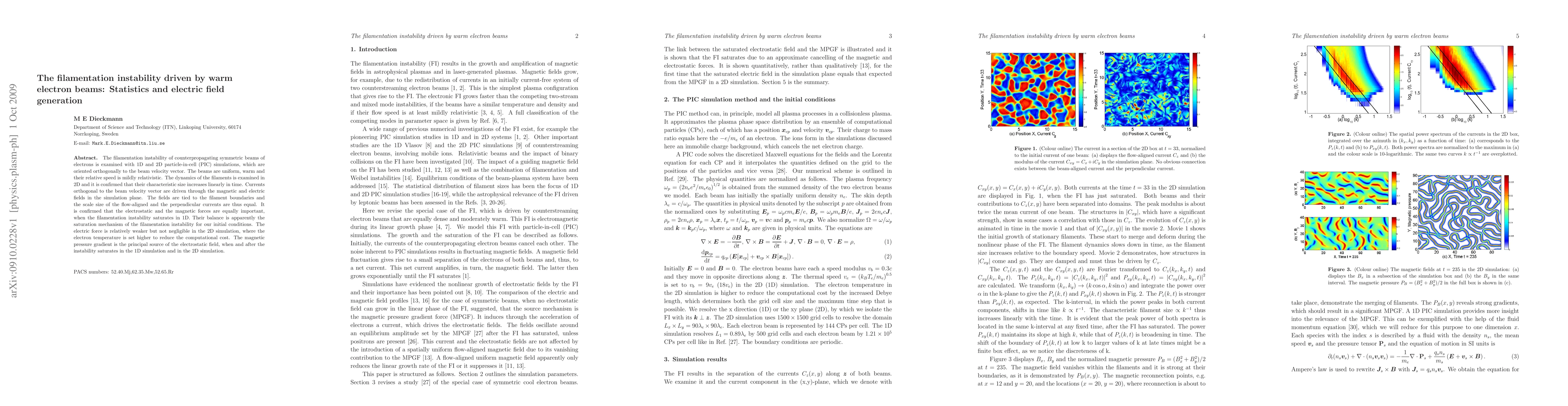 This paper investigates the filamentation instability driven by warm electron beams using 1D and 2D PIC simulations, finding that the instability saturates when electrostatic and magnetic forces balance. The electric field generation is primarily due to the magnetic pressure gradient.