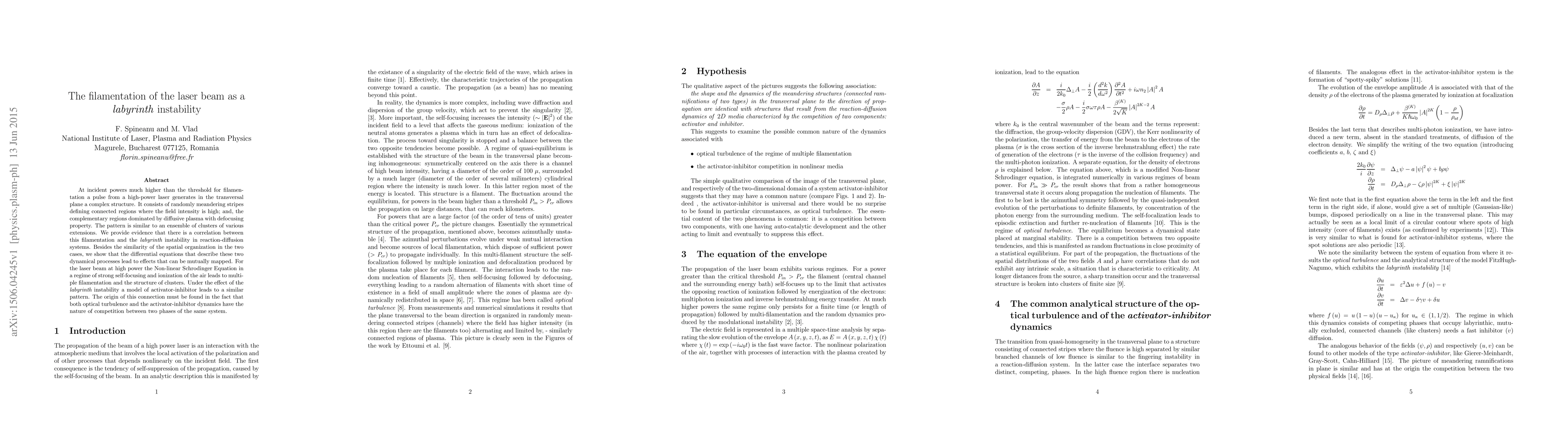 This paper investigates the filamentation of high-power laser beams, revealing a complex, labyrinth-like structure in the transversal plane. It correlates this optical phenomenon with the labyrinth instability in reaction-diffusion systems, showing that both processes can be mutually mapped through their underlying differential equations.