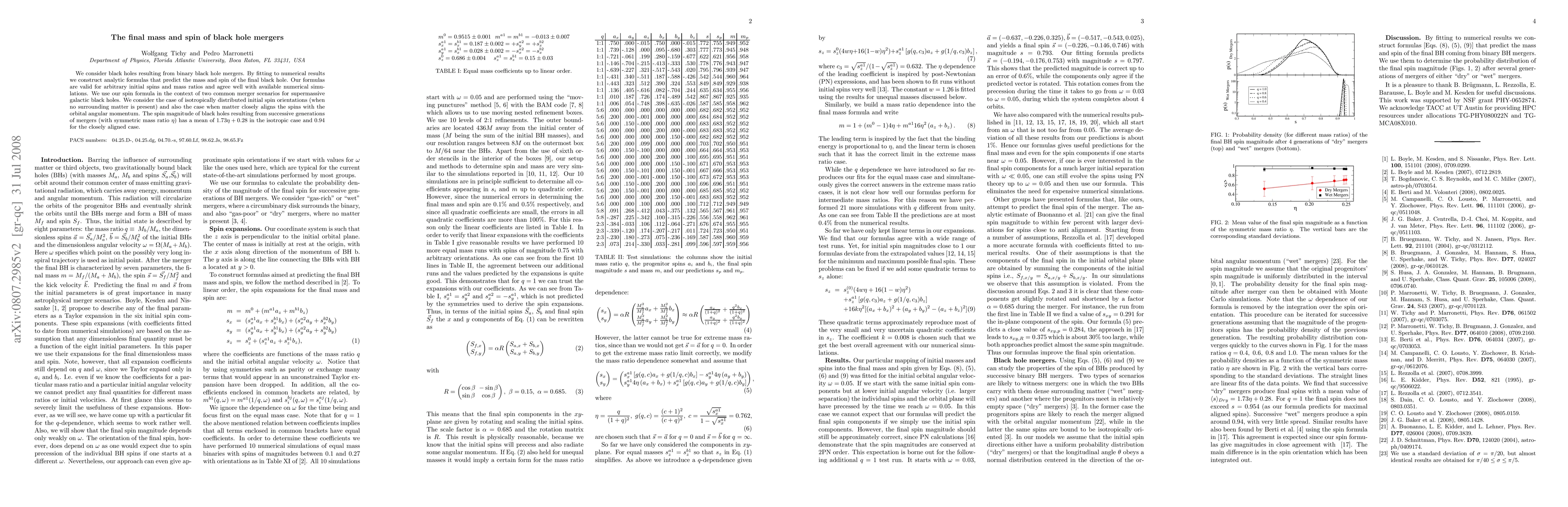 This paper develops analytic formulas to predict the final mass and spin of black holes from binary mergers, validated against numerical simulations. It examines spin magnitudes in two merger scenarios, finding a mean spin of 1.73η + 0.28 for isotropically distributed spins and 0.94 for aligned spins.