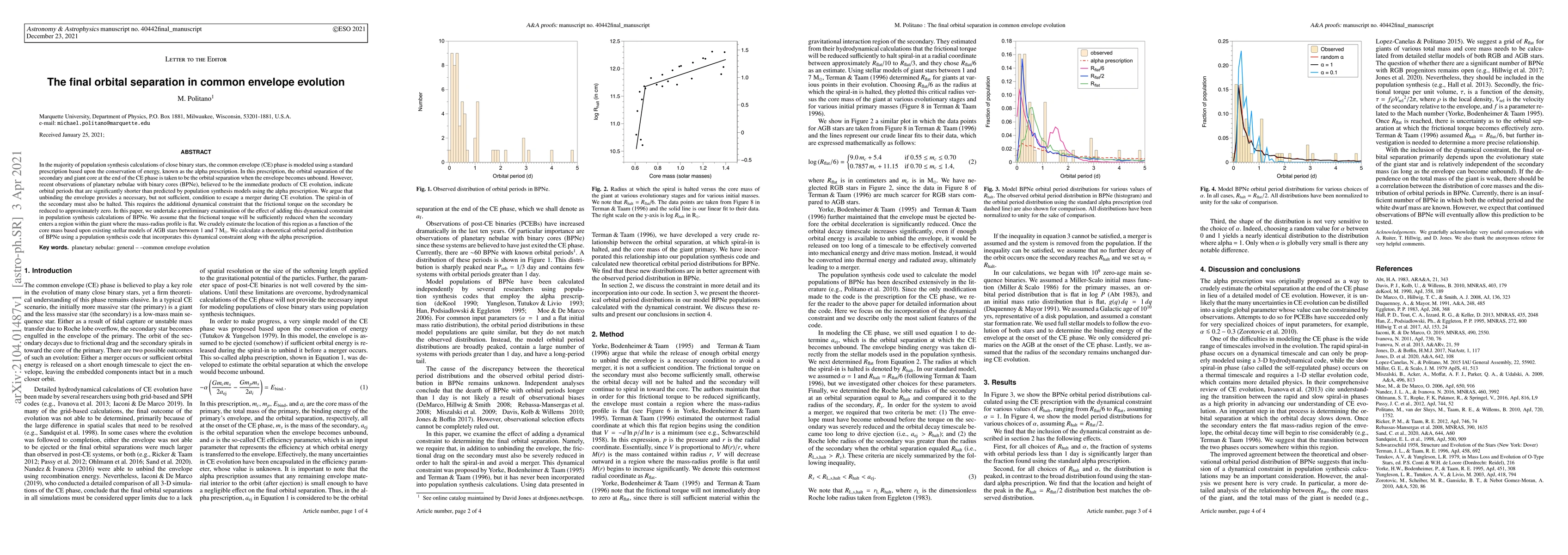 This paper examines the final orbital separation in common envelope evolution, arguing that halting the spiral-in of the secondary requires reducing the frictional torque to zero, not just unbinding the envelope. It proposes a new dynamical constraint based on the mass-radius profile of the giant star and uses a population synthesis code to estimate the resulting orbital period distribution for binary planetary nebulae.