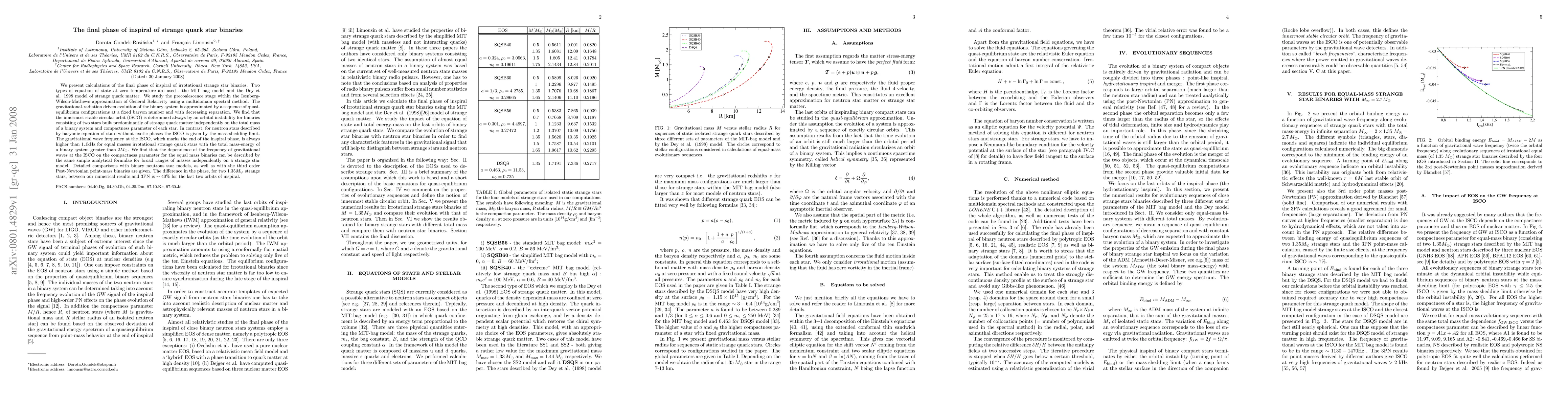 This paper investigates the final phase of inspiral in strange quark star binaries, finding that the innermost stable circular orbit (ISCO) is determined by orbital instability rather than mass-shedding. Gravitational wave frequencies at the ISCO exceed 1.1kHz for binaries with total mass-energy greater than $2 M_\odot$, and the phase difference between numerical results and 3PN approximations is significant in the last orbits of inspiral.