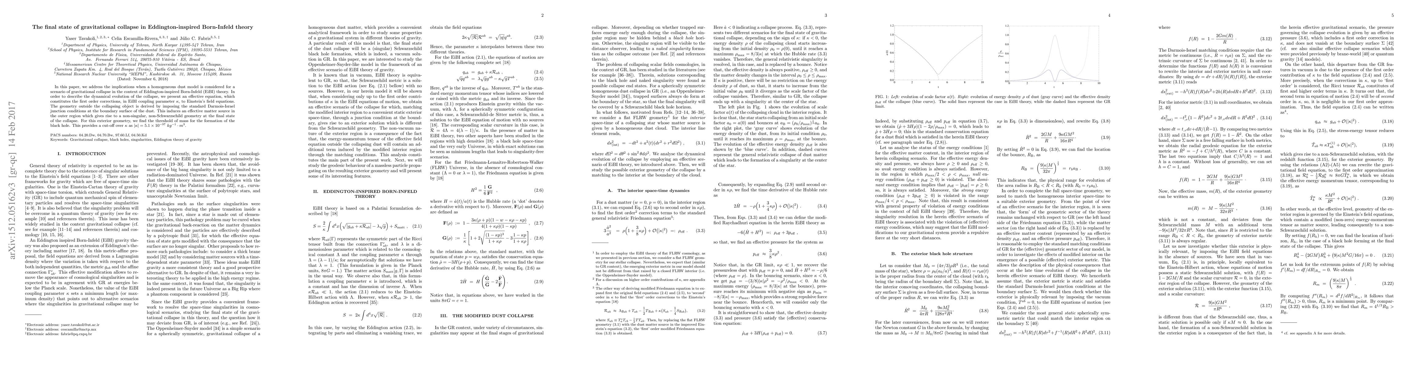 In this paper, we address the implications when a homogeneous dust model is considered for a scenario of gravitational collapse in the context of Eddington-inspired Born-Infeld (EiBI) theory. In order to describe the dynamical evolution of the collapse, we present an effective equation, which constitutes the first order corrections, in EiBI coupling parameter $\kappa$, to Einstein's field equations. The geometry outside the collapsing object is derived by imposing the standard Darmois-Israel junction conditions at the boundary surface of the dust. This induces an effective matter source in the outer region which gives rise to a non-singular, non-Schwarzschild geometry at the final state of the collapse. For this exterior geometry, we find the threshold of mass for the formation of the black hole. This provides a cut-off over $\kappa$ as $|\kappa|=5.1\times10^{-97} ~kg^{-1}\cdot m^3$.