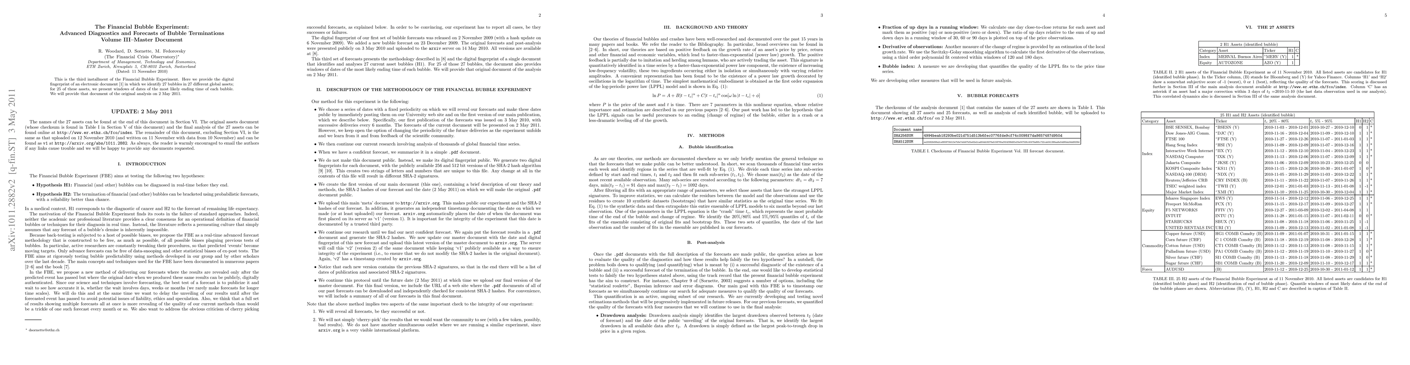 This is the third installment of the Financial Bubble Experiment. Here we provide the digital fingerprint of an electronic document in which we identify 27 bubbles in 27 different global assets; for 25 of these assets, we present windows of dates of the most likely ending time of each bubble. We will provide that document of the original analysis on 2 May 2011.