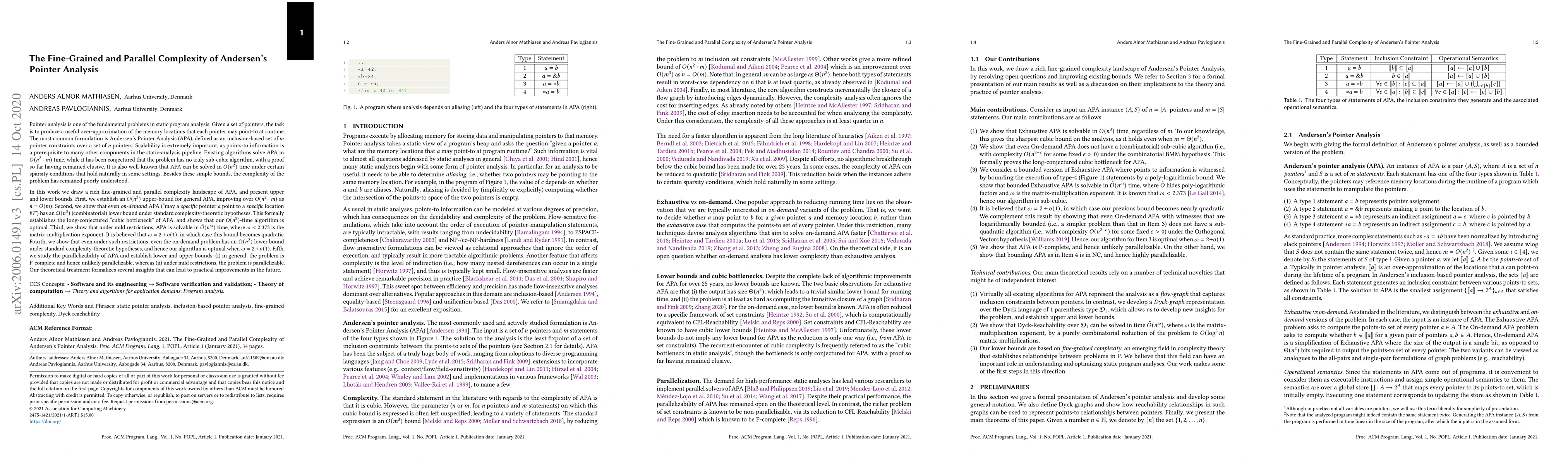 Pointer analysis is one of the fundamental problems in static program analysis. Given a set of pointers, the task is to produce a useful over-approximation of the memory locations that each pointer may point-to at runtime. The most common formulation is Andersen's Pointer Analysis (APA), defined as an inclusion-based set of $m$ pointer constraints over a set of $n$ pointers. Existing algorithms solve APA in $O(n^2\cdot m)$ time, while it has been conjectured that the problem has no truly sub-cubic algorithm, with a proof so far having remained elusive. In this work we draw a rich fine-grained and parallel complexity landscape of APA, and present upper and lower bounds. First, we establish an $O(n^3)$ upper-bound for general APA, improving over $O(n^2\cdot m)$ as $n=O(m)$. Second, we show that even on-demand APA ("may a specific pointer $a$ point to a specific location $b$?") has an $\Omega(n^3)$ (combinatorial) lower bound under standard complexity-theoretic hypotheses. This formally establishes the long-conjectured "cubic bottleneck" of APA, and shows that our $O(n^3)$-time algorithm is optimal. Third, we show that under mild restrictions, APA is solvable in $\tilde{O}(n^{\omega})$ time, where $\omega<2.373$ is the matrix-multiplication exponent. It is believed that $\omega=2+o(1)$, in which case this bound becomes quadratic. Fourth, we show that even under such restrictions, even the on-demand problem has an $\Omega(n^2)$ lower bound under standard complexity-theoretic hypotheses, and hence our algorithm is optimal when $\omega=2+o(1)$. Fifth, we study the parallelizability of APA and establish lower and upper bounds: (i) in general, the problem is P-complete and hence unlikely parallelizable, whereas (ii) under mild restrictions, the problem is parallelizable. Our theoretical treatment formalizes several insights that can lead to practical improvements in the future.