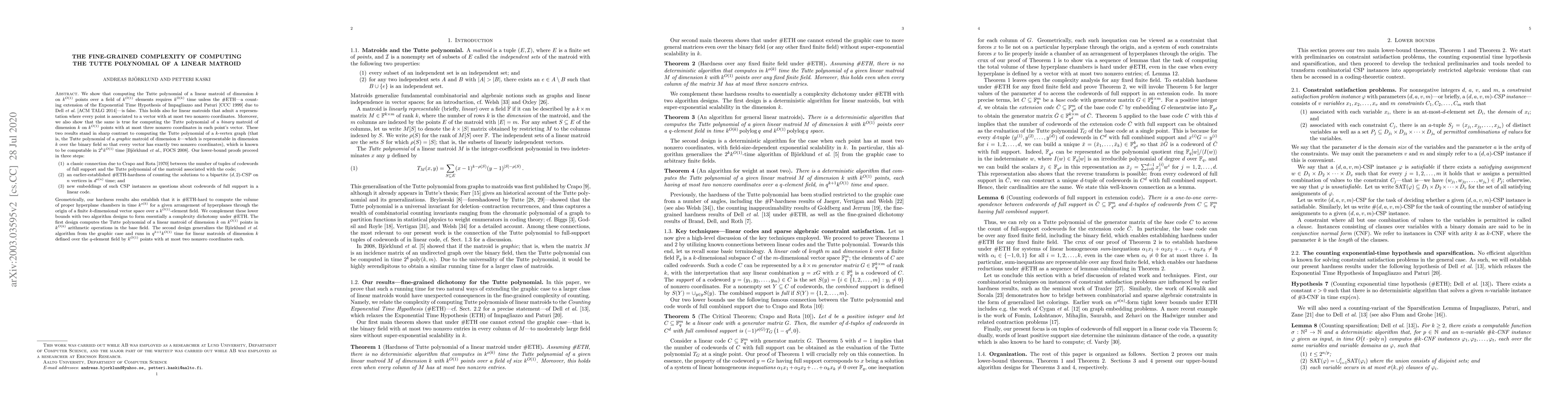 This paper establishes a fine-grained complexity lower bound for computing the Tutte polynomial of linear and binary matroids, showing it requires $k^{\Omega(k)}$ time unless \#ETH is false. It contrasts this complexity with the polynomial-time computability of the Tutte polynomial for graphic matroids. The proofs leverage connections to codeword tuples and bipartite CSP counting, supplemented by two polynomial-time algorithms for specific cases.