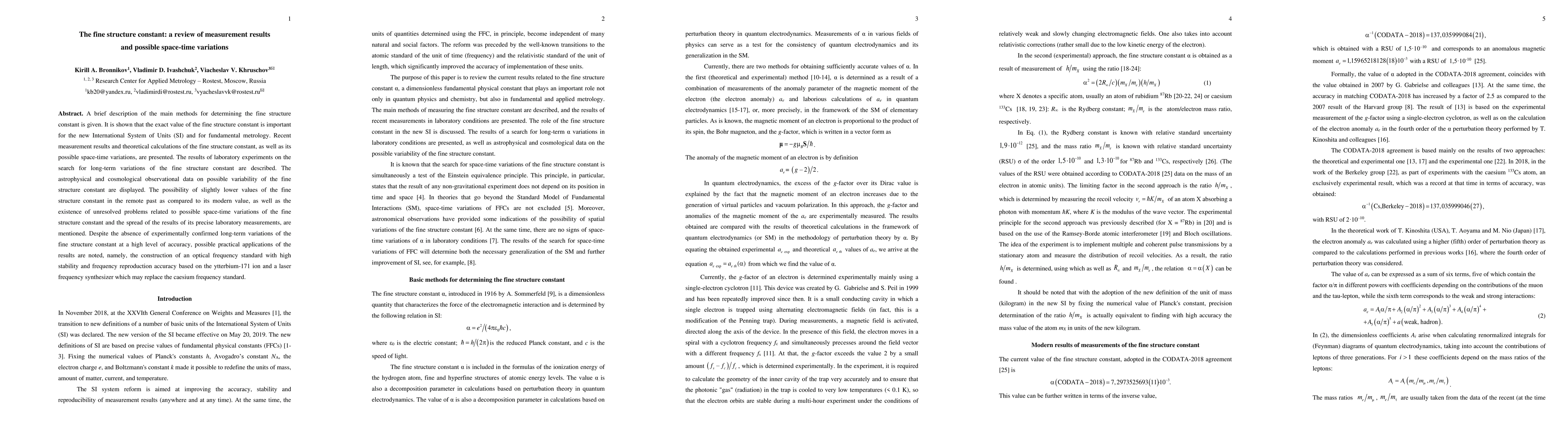 The paper presents a comprehensive review of measurement results and theoretical calculations of the fine structure constant, including laboratory experiments and astrophysical observations.