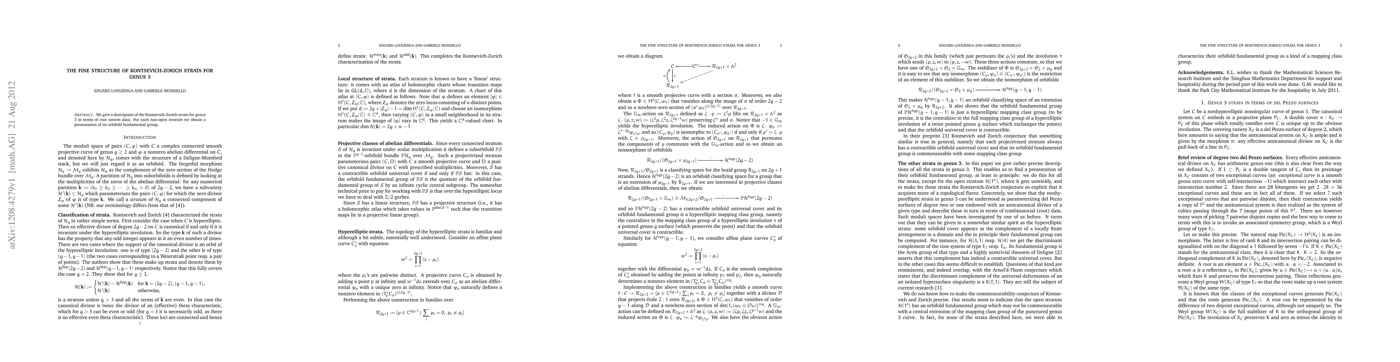 This paper describes the Kontsevich-Zorich strata for genus 3 using root system data and provides a presentation of the orbifold fundamental group for each non-open stratum. The focus is on the fine structural details of these complex geometric objects.
