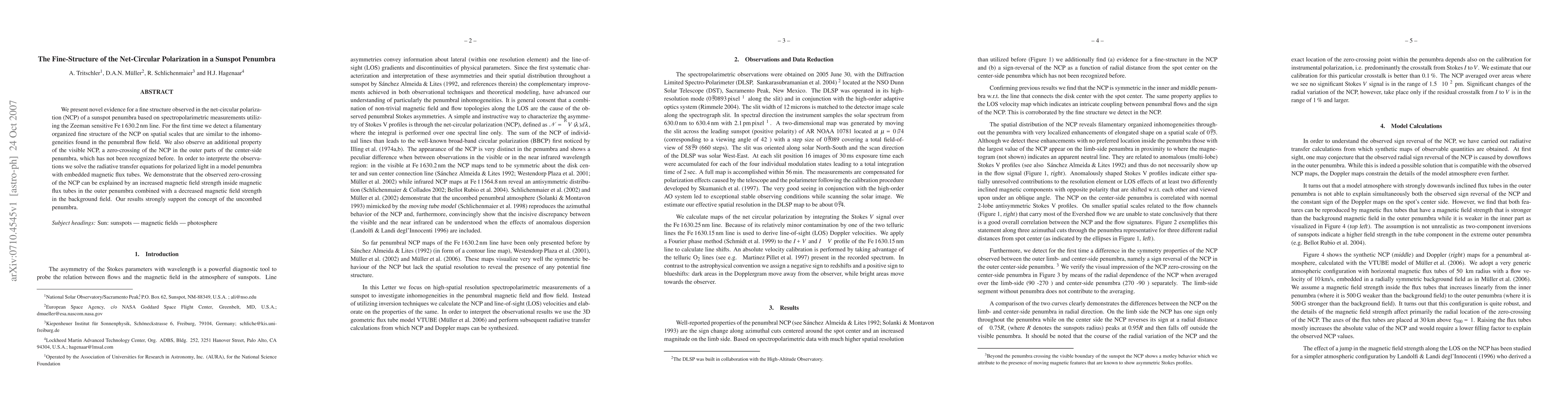 We present novel evidence for a fine structure observed in the net-circular polarization (NCP) of a sunspot penumbra based on spectropolarimetric measurements utilizing the Zeeman sensitive FeI 630.2 nm line. For the first time we detect a filamentary organized fine structure of the NCP on spatial scales that are similar to the inhomogeneities found in the penumbral flow field. We also observe an additional property of the visible NCP, a zero-crossing of the NCP in the outer parts of the center-side penumbra, which has not been recognized before. In order to interprete the observations we solve the radiative transfer equations for polarized light in a model penumbra with embedded magnetic flux tubes. We demonstrate that the observed zero-crossing of the NCP can be explained by an increased magnetic field strength inside magnetic flux tubes in the outer penumbra combined with a decreased magnetic field strength in the background field. Our results strongly support the concept of the uncombed penumbra.