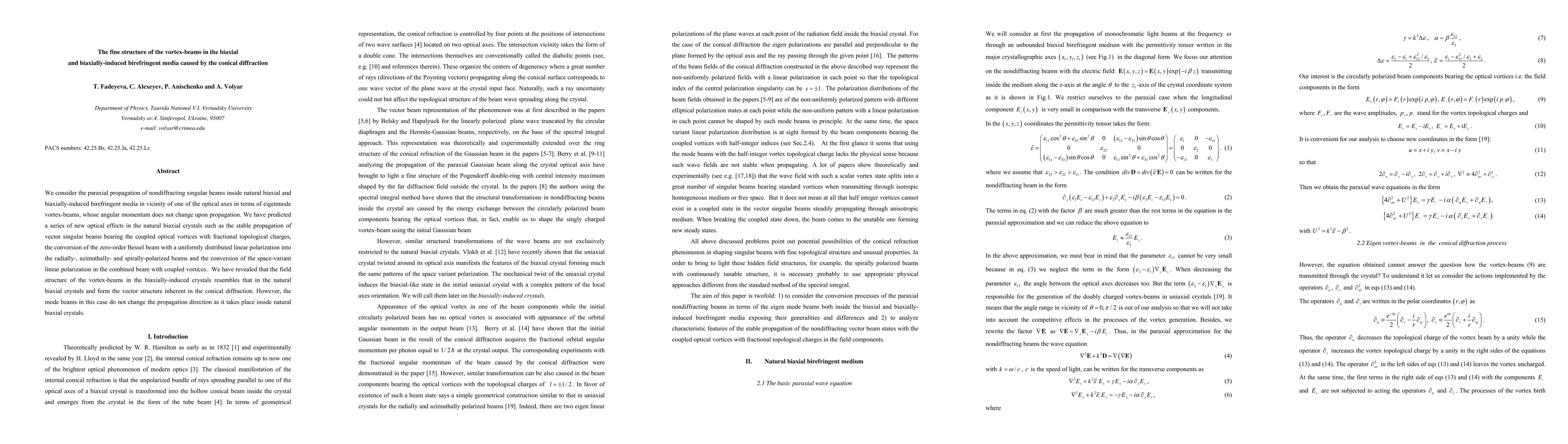 We consider the paraxial propagation of nondiffracting singular beams inside natural biaxial and biaxially-induced birefringent media in vicinity of one of the optical axes in terms of eigenmode vortex-beams, whose angular momentum does not change upon propagation. We have predicted a series of new optical effects in the natural biaxial crystals such as the stable propagation of vector singular beams bearing the coupled optical vortices with fractional topological charges, the conversion of the zero-order Bessel beam with a uniformly distributed linear polarization into the radially-, azimuthally- and spirally-polarized beams and the conversion of the space-variant linear polarization in the combined beam with coupled vortices. We have revealed that the field structure of the vortex-beams in the biaxially-induced crystals resembles that in the natural biaxial crystals and form the vector structure inherent in the conical diffraction. However, the mode beams in this case do not change the propagation direction as it takes place inside natural biaxial crystals.