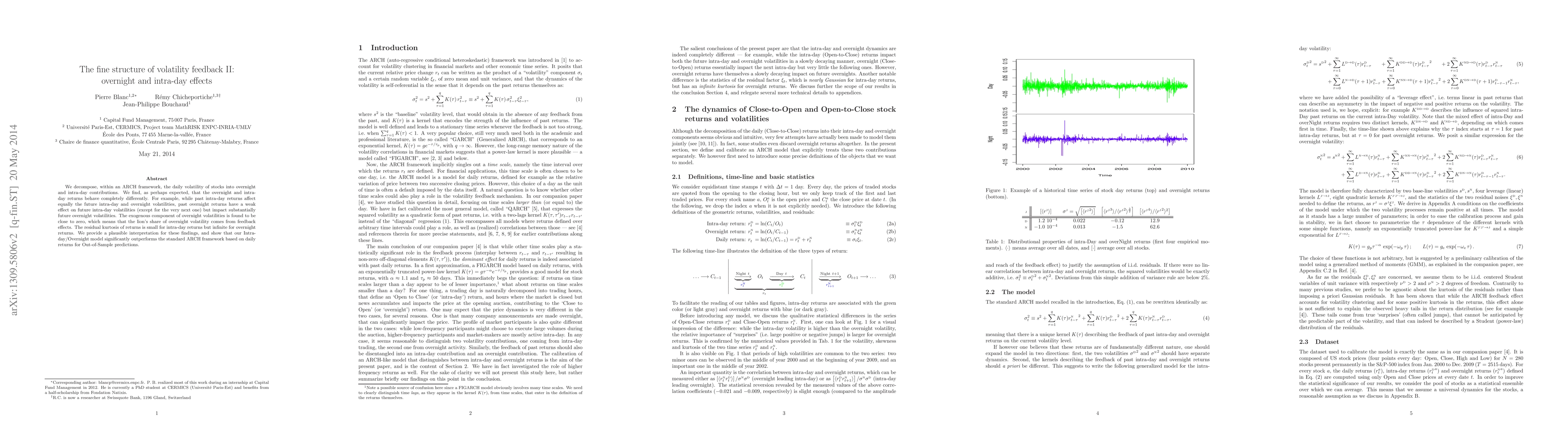 We decompose, within an ARCH framework, the daily volatility of stocks into overnight and intra-day contributions. We find, as perhaps expected, that the overnight and intra-day returns behave completely differently. For example, while past intra-day returns affect equally the future intra-day and overnight volatilities, past overnight returns have a weak effect on future intra-day volatilities (except for the very next one) but impact substantially future overnight volatilities. The exogenous component of overnight volatilities is found to be close to zero, which means that the lion's share of overnight volatility comes from feedback effects. The residual kurtosis of returns is small for intra-day returns but infinite for overnight returns. We provide a plausible interpretation for these findings, and show that our Intra-Day/Overnight model significantly outperforms the standard ARCH framework based on daily returns for Out-of-Sample predictions.