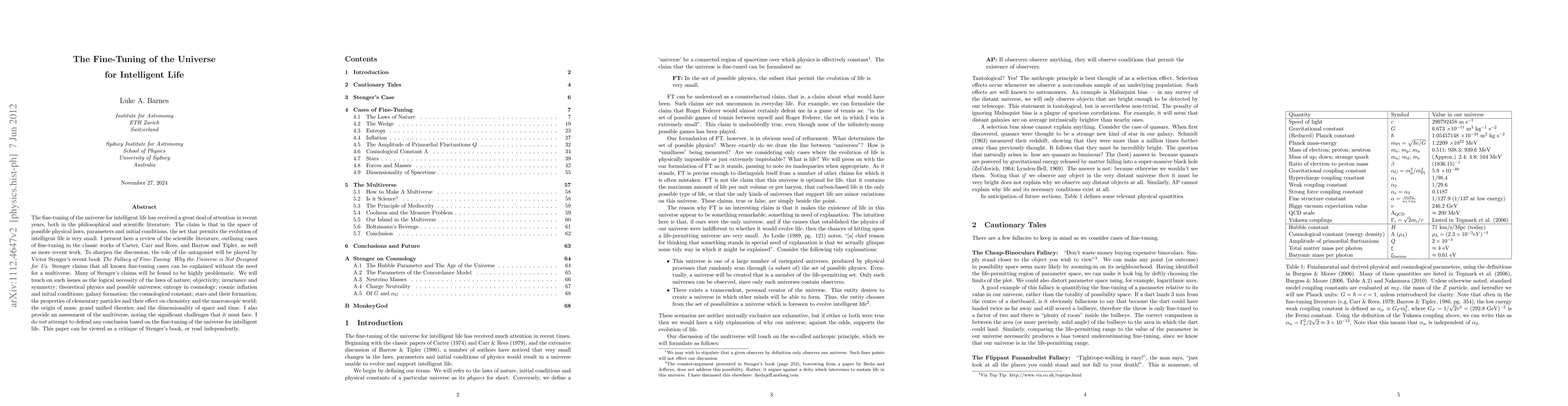 This paper reviews the scientific literature on the fine-tuning of the universe for intelligent life, critiquing Victor Stenger's arguments against the necessity of a multiverse, and discusses various physical parameters and conditions that support life, without drawing definitive conclusions.
