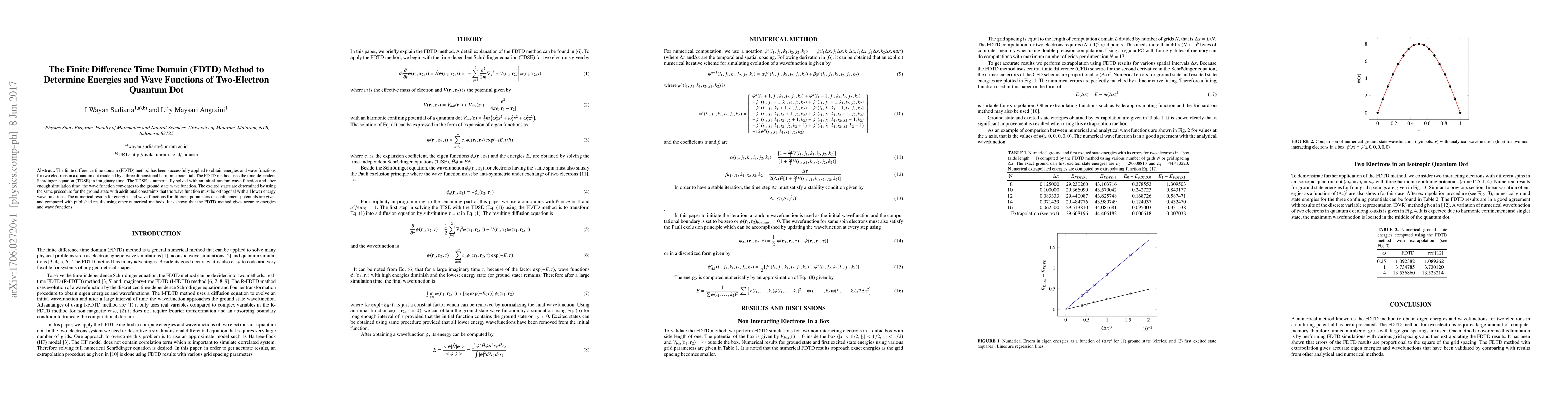 The FDTD method accurately determines energies and wave functions for two electrons in a quantum dot using the time-dependent Schrödinger equation in imaginary time, with results comparable to other numerical methods. Excited states are identified by orthogonality constraints to lower energy states.