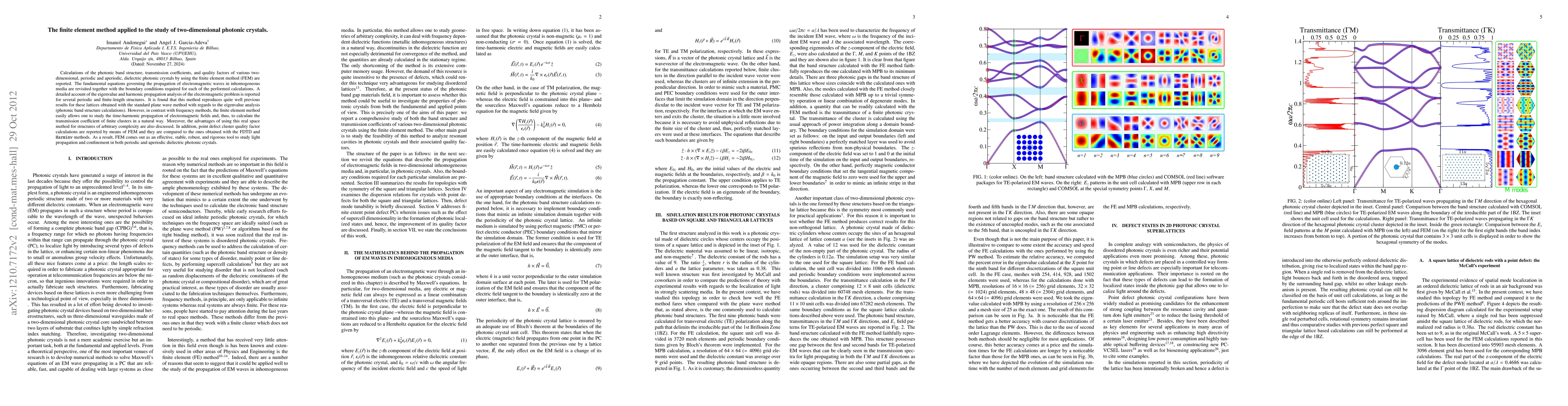 This paper applies the finite element method (FEM) to analyze the photonic band structure and transmission coefficients of two-dimensional photonic crystals, demonstrating its effectiveness and robustness compared to other methods. FEM allows for detailed study of time-harmonic propagation and complex structures, outperforming other techniques in stability and flexibility.