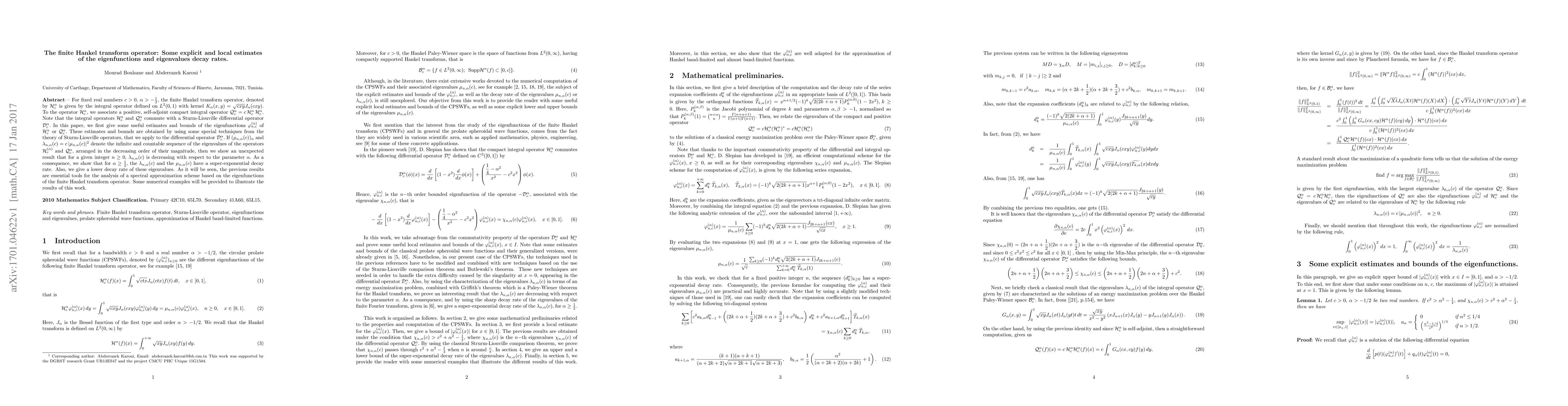 For fixed real numbers $c>0,$ $\alpha>-\frac{1}{2},$ the finite Hankel transform operator, denoted by $\mathcal{H}_c^{\alpha}$ is given by the integral operator defined on $L^2(0,1)$ with kernel $K_{\alpha}(x,y)= \sqrt{c xy} J_{\alpha}(cxy).$ To the operator $\mathcal{H}_c^{\alpha},$ we associate a positive, self-adjoint compact integral operator $\mathcal Q_c^{\alpha}=c\, \mathcal{H}_c^{\alpha}\, \mathcal{H}_c^{\alpha}.$ Note that the integral operators $\mathcal{H}_c^{\alpha}$ and $\mathcal Q_c^{\alpha}$ commute with a Sturm-Liouville differential operator $\mathcal D_c^{\alpha}.$ In this paper, we first give some useful estimates and bounds of the eigenfunctions $\vp$ of $\mathcal H_c^{\alpha}$ or $\mathcal Q_c^{\alpha}.$ These estimates and bounds are obtained by using some special techniques from the theory of Sturm-Liouville operators, that we apply to the differential operator $\mathcal D_c^{\alpha}.$ If $(\mu_{n,\alpha}(c))_n$ and $\lambda_{n,\alpha}(c)=c\, |\mu_{n,\alpha}(c)|^2$ denote the infinite and countable sequence of the eigenvalues of the operators $\mathcal{H}_c^{(\alpha)}$ and $\mathcal Q_c^{\alpha},$ arranged in the decreasing order of their magnitude, then we show an unexpected result that for a given integer $n\geq 0,$ $\lambda_{n,\alpha}(c)$ is decreasing with respect to the parameter $\alpha.$ As a consequence, we show that for $\alpha\geq \frac{1}{2},$ the $\lambda_{n,\alpha}(c)$ and the $\mu_{n,\alpha}(c)$ have a super-exponential decay rate. Also, we give a lower decay rate of these eigenvalues. As it will be seen, the previous results are essential tools for the analysis of a spectral approximation scheme based on the eigenfunctions of the finite Hankel transform operator. Some numerical examples will be provided to illustrate the results of this work.