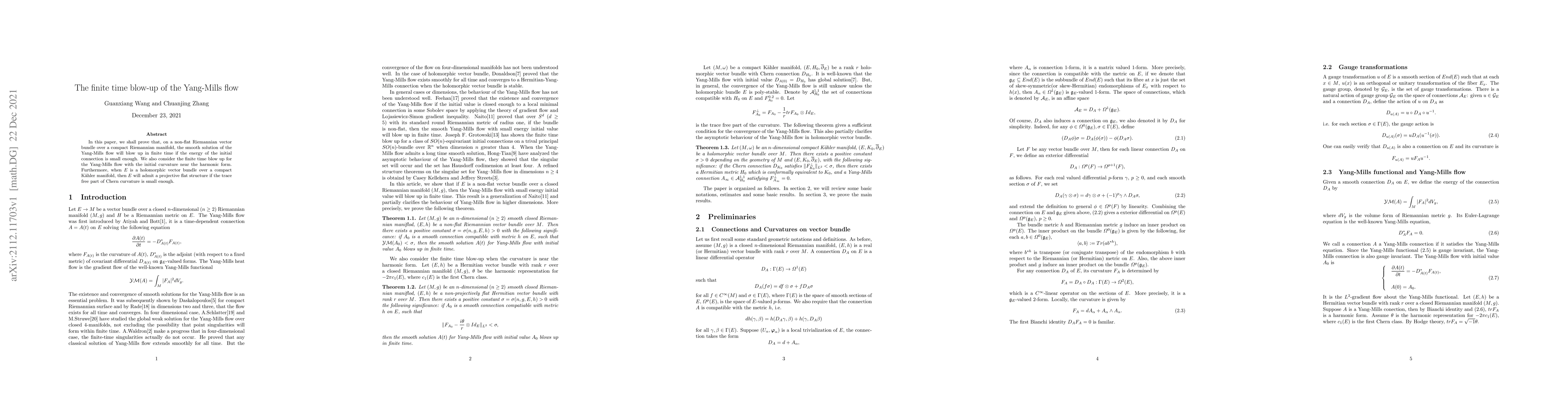 The Yang-Mills flow on a non-flat Riemannian vector bundle over a compact manifold blows up in finite time if the initial connection has low energy, and similar results hold for the trace-free part of Chern curvature.