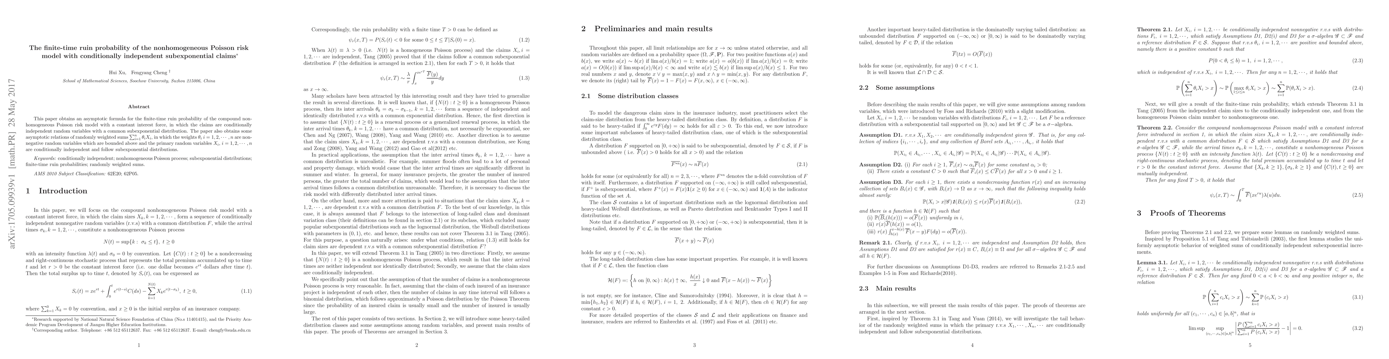 This paper provides an asymptotic formula for the finite-time ruin probability in a nonhomogeneous Poisson risk model with subexponential claims and a constant interest force. It also explores asymptotic properties of randomly weighted sums of conditionally independent subexponential random variables.