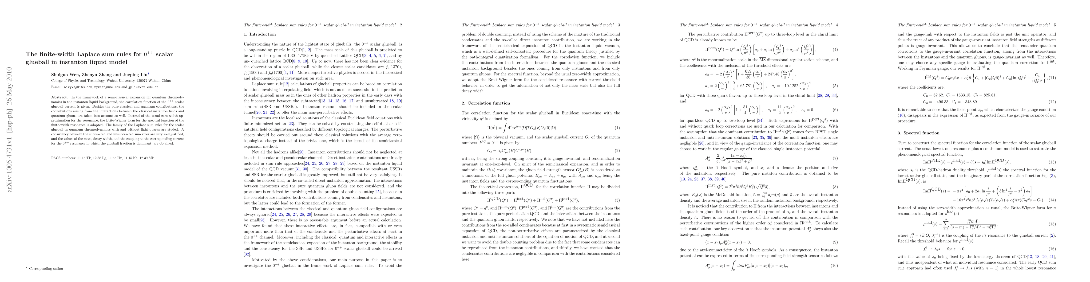 This paper investigates the finite-width Laplace sum rules for the $0^{++}$ scalar glueball in the instanton liquid model of quantum chromodynamics, considering both classical and quantum gluon interactions. It finds consistency between subtracted and unsubtracted sum rules and determines the mass, decay width, and coupling of the dominant glueball resonance.