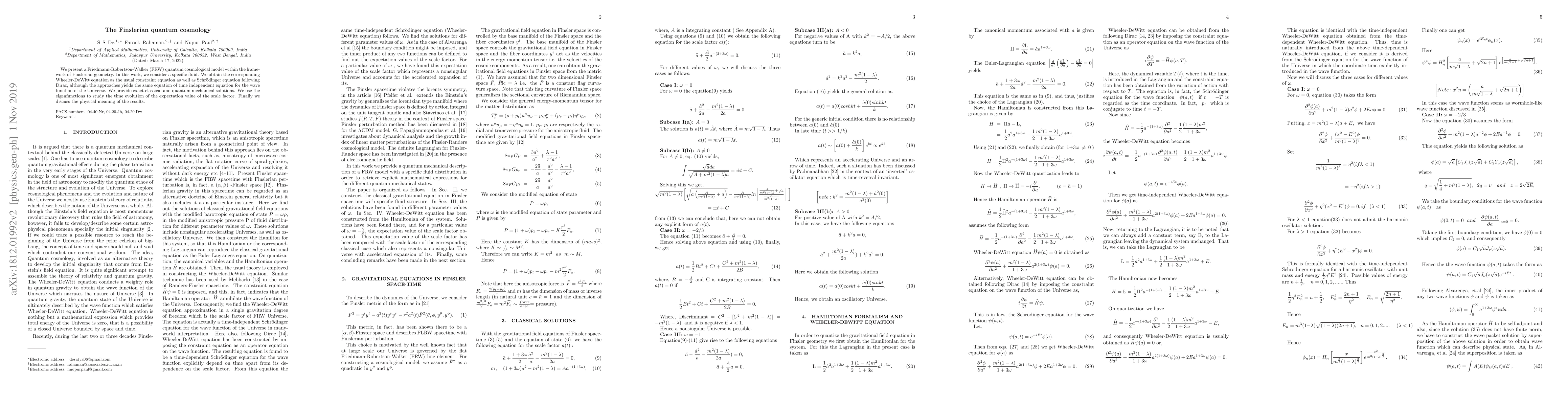 This research introduces a Finslerian geometry-based quantum cosmological model using the Friedmann-Robertson-Walker metric, deriving a time-independent Schrödinger equation for the universe's wave function. Exact classical and quantum solutions are provided, and the time evolution of the scale factor's expectation value is analyzed. The study discusses the physical implications of the results.