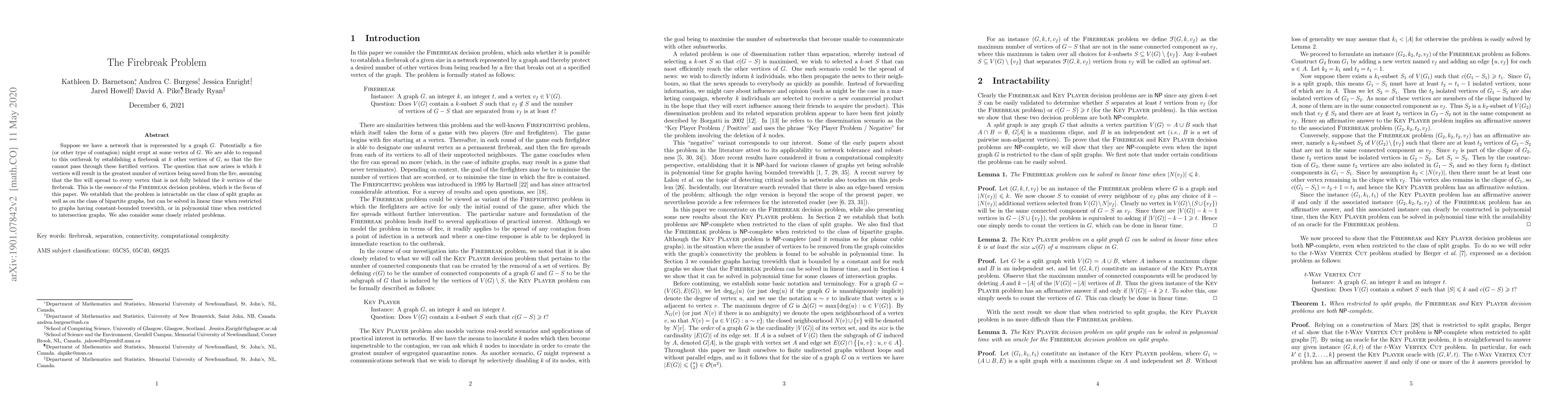 This paper investigates the Firebreak decision problem in network graphs, where identifying optimal vertices to establish firebreaks maximizes the number of vertices saved from fire spread. The authors find the problem intractable on split and bipartite graphs but solvable efficiently on graphs with bounded treewidth or intersection graphs.