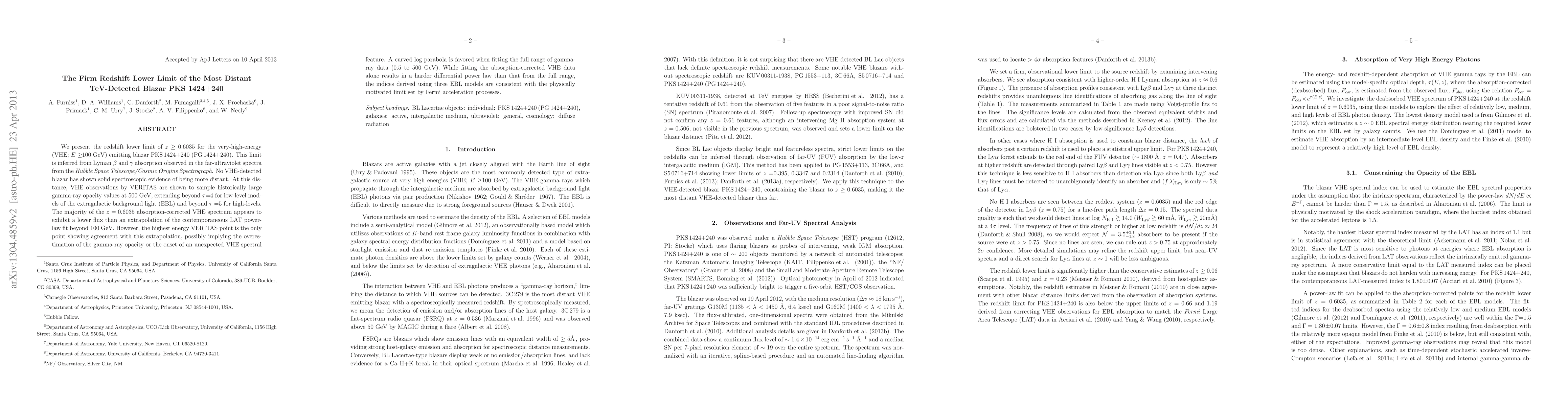 Researchers set a new limit for the distance of the most distant TeV-detected blazar PKS 1424+240 at z>0.6035, found through Lyman beta absorption observed in far-ultraviolet spectra.