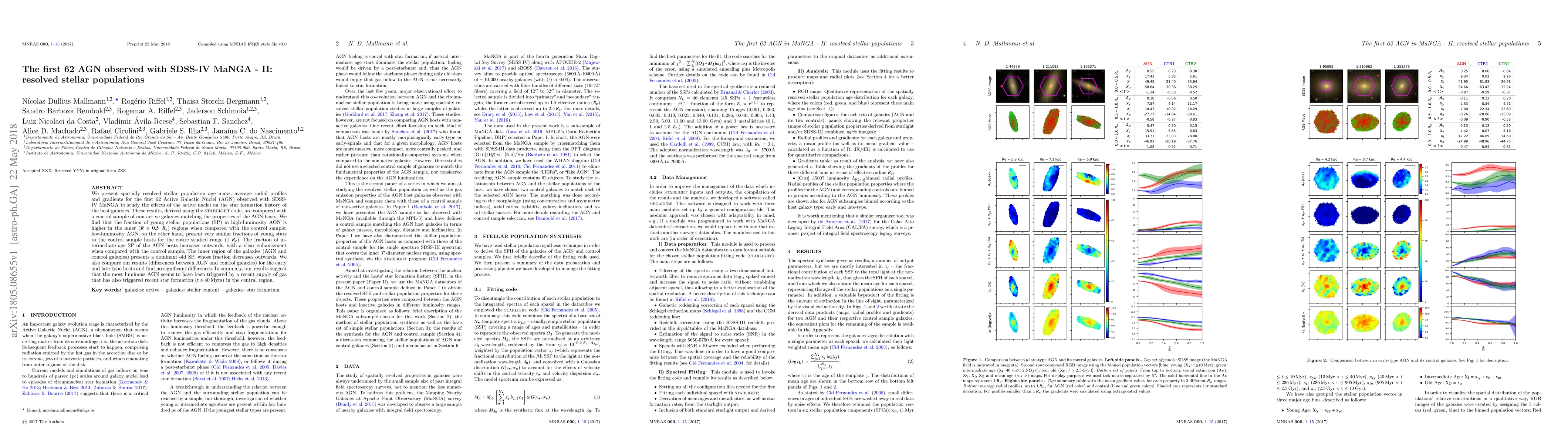 We present spatially resolved stellar population age maps, average radial profiles and gradients for the first 62 Active Galactic Nuclei (AGN) observed with SDSS-IV MaNGA to study the effects of the active nuclei on the star formation history of the host galaxies. These results, derived using the STARLIGHT code, are compared with a control sample of non-active galaxies matching the properties of the AGN hosts. We find that the fraction of young stellar populations (SP) in high-luminosity AGN is higher in the inner ($R \leq 0.5\,R_e$) regions when compared with the control sample; low-luminosity AGN, on the other hand, present very similar fractions of young stars to the control sample hosts for the entire studied range ($1\,R_e$). The fraction of intermediate age SP of the AGN hosts increases outwards, with a clear enhancement when compared with the control sample. The inner region of the galaxies (AGN and control galaxies) presents a dominant old SP, whose fraction decreases outwards. We also compare our results (differences between AGN and control galaxies) for the early and late-type hosts and find no significant differences. In summary, our results suggest that the most luminous AGN seems to have been triggered by a recent supply of gas that has also triggered recent star formation ($t\,\leq\,40\,Myrs$) in the central region.